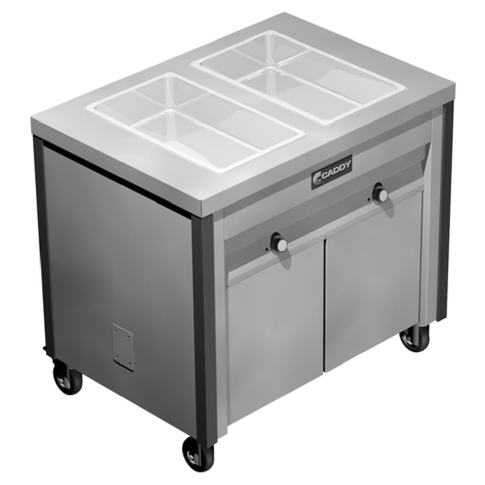 The Caddy TF-622 Hot Food Caddy Electric Enclosed Heated Base is a versatile food service solution engineered for maintaining optimal food temperatures across varied dining environments. With dimensions of 37"W x 26"D x 34"H, it boasts a compact yet efficient design, suitable for busy kitchens and catering services. The unit features two 12" x 20" x 6-3/8" deep insulated hot food wells, each equipped with individual heat controls, allowing precise temperature management for diverse menu items. Additionally, the caddy includes two compartments capable of accommodating up to eight full-size 2-1/2" deep pans, maximizing its capacity for large-scale food preparation. Constructed from durable stainless steel, the TF-622 ensures longevity and reliability in demanding settings. The inclusion of vertical corner bumpers offers protection against impacts, enhancing durability during transit. Its mobility is facilitated by 4" swivel casters, two of which are equipped with brakes, ensuring stability when stationary. Certified by ETLus and NSF, this hot food caddy meets stringent safety and sanitation standards, affirming its suitability for professional culinary operations. The Caddy TF-622 is an indispensable asset for establishments seeking efficient food transport and temperature control in their food service operations.