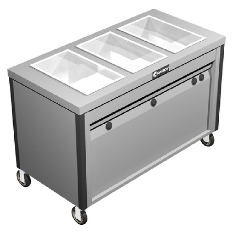 The Caddy TF-623 Hot Food Caddy Electric Enclosed Heated Base is an advanced catering solution designed to meet the demanding needs of foodservice establishments. Measuring 52 inches in width, 26 inches in depth, and 34 inches in height, this unit is engineered for optimal performance and space efficiency. It features three 12-inch by 20-inch by 6-3/8-inch deep hot food wells, providing ample space for a variety of dishes. The insulated wells are equipped with individual heat controls, allowing precise temperature management for different food types. Additionally, the caddy's three compartments can accommodate 12 full-size, 2-1/2-inch deep pans, making it ideal for high-volume operations. Constructed from durable stainless steel, the unit ensures longevity and easy maintenance. To enhance mobility, the caddy is fitted with 4-inch swivel casters, including two with brakes, ensuring stable positioning when required. Vertical corner bumpers protect the caddy and surroundings from accidental impact, enhancing safety. Certified by ETLus and NSF, this hot food caddy assures compliance with industry safety and sanitation standards. The Caddy TF-623 is a versatile and robust choice for caterers, event organizers, and institutional kitchens, offering reliable hot food storage and transportation in a compact, efficient design.
