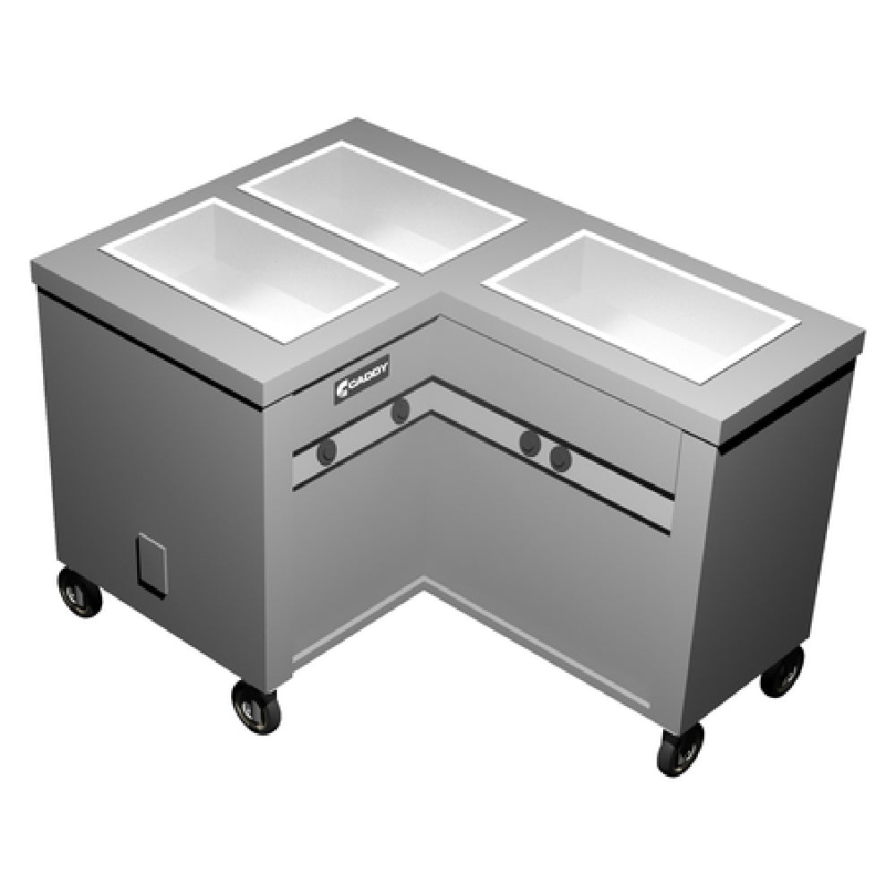 The Caddy TF-623-R Hot Food Caddy Electric Enclosed Heated Base is an industrial-grade solution designed for the efficient storage and heating of food in commercial settings. This versatile appliance features three L-shaped, right-hand insulated wells, each measuring 12" x 20" x 6-3/8" deep, with individual heat controls, allowing for precise temperature management of various food items. This ensures that different food types can be maintained at optimal serving temperatures simultaneously. The caddy also includes two compartments that can accommodate up to eight full-size pans, each 2-1/2" deep, providing substantial storage capacity for large-scale food operations. Constructed from durable stainless steel, it guarantees longevity and resistance to wear and tear in busy environments. The unit is equipped with vertical corner bumpers and four swivel casters, two of which have brakes, allowing for easy mobility and secure placement within a kitchen or serving area. Certified by ETLus and NSF, the Caddy TF-623-R meets strict safety and sanitation standards, making it a reliable choice for catering services, restaurants, and institutional dining facilities. Its thoughtful design and robust features make it an essential asset in professional food service environments, where efficiency and reliability are paramount.