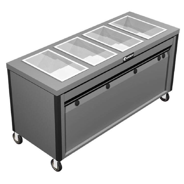 The Caddy TF-624 Hot Food Caddy Electric Enclosed Heated Base is a versatile and robust solution for food service industries requiring efficient hot food storage and transport. Measuring 67 inches in width, 26 inches in depth, and 34 inches in height, this unit features four 12-inch by 20-inch by 6-3/8-inch deep hot food wells, each with individual heat controls for precise temperature management. The insulated wells are designed to maintain consistent heat levels, ensuring food remains at optimal serving temperatures. Additionally, the caddy accommodates 16 full-size 2-1/2-inch deep pans across its four compartments, maximizing its storage capability. Constructed from durable stainless steel, it is built to withstand rigorous demands while maintaining a sleek appearance. The inclusion of vertical corner bumpers provides protection in high-traffic environments, and the 4-inch swivel casters, two of which have brakes, contribute to its ease of mobility and stability. Certified by ETLus and NSF, the Caddy TF-624 meets stringent safety and sanitation standards, making it a reliable choice for various food service applications. Its comprehensive features and durable design make it an essential asset for catering services, commercial kitchens, and other professional food settings.