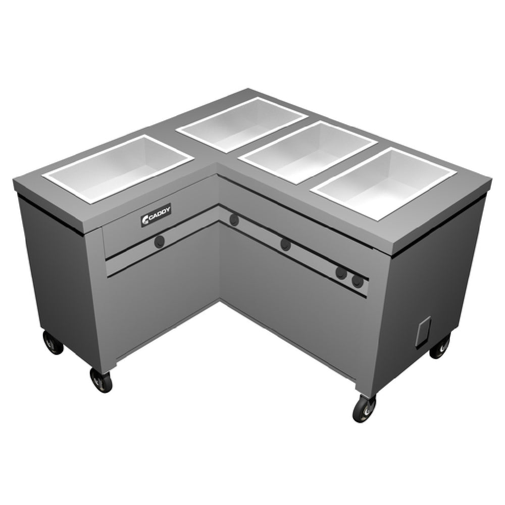 The Caddy TF-624-L Hot Food Caddy Electric Enclosed Heated Base is an advanced solution for food service operations requiring precise temperature control and efficient food storage. This unit features an electric, enclosed heated base, equipped with four L-shaped 12" x 20" x 6-3/8" deep hot food wells, each with its own individual heat control. The left-hand, insulated wells ensure that different dishes are kept at their optimal serving temperatures, catering specifically to operations needing varied heating requirements simultaneously. Additionally, it offers three spacious compartments that can accommodate up to twelve full-size 2-1/2" deep pans, providing ample storage for large-scale food service needs. Constructed from durable stainless steel, the TF-624-L is designed to withstand the rigors of busy kitchen environments, while its vertical corner bumpers offer added protection against impacts. For enhanced mobility, the unit is fitted with 4" swivel casters, two of which are lockable to secure the caddy in place during service. Certified by ETLus and NSF, this hot food caddy meets high standards for quality and safety, making it a reliable asset for restaurants, catering services, and institutional kitchens aiming for operational efficiency and food quality assurance.