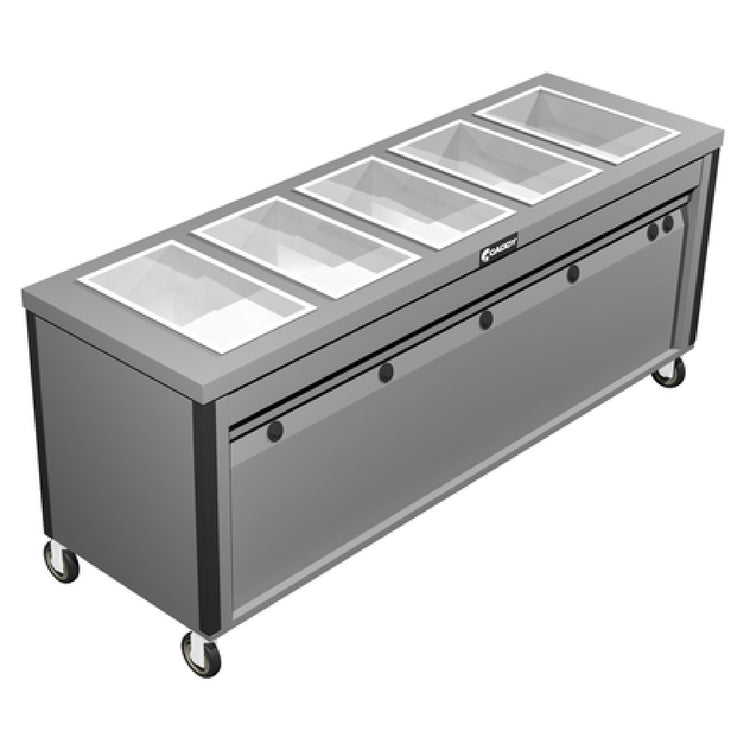 The Caddy TF-625 Hot Food Caddy Electric Enclosed Heated Base is a versatile and efficient solution for professional food service operations. Measuring 82 inches wide, 26 inches deep, and 34 inches high, this unit is designed to accommodate the demanding needs of commercial kitchens. It features five 12-inch by 20-inch by 6-3/8-inch deep hot food wells, each insulated and equipped with individual heat controls, ensuring precise temperature management for various dishes. The caddy’s five compartments can hold up to 20 full-size 2-1/2-inch deep pans, making it ideal for high-volume food storage and service. Constructed from durable stainless steel, the unit is built to withstand the rigors of daily use while maintaining a professional appearance. For added mobility and safety, the caddy is fitted with 4-inch swivel casters, two of which are equipped with brakes, allowing for secure placement during operation. Vertical corner bumpers provide additional protection against accidental impact. Certified by ETLus and NSF, the Caddy TF-625 meets high standards of safety and sanitation, making it a reliable choice for restaurants, catering services, and institutional kitchens requiring robust, efficient, and safe hot food storage solutions.