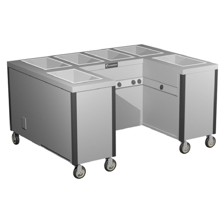 The Caddy TF-626-U Hot Food Caddy Electric Enclosed Heated Base is an advanced solution engineered for diverse commercial food service environments. This unit features (6) U-shaped, insulated hot food wells, each measuring 12" x 20" x 6-3/8" deep, equipped with individual heat controls to maintain precise temperature settings for various food items. Designed to accommodate (3) compartments, it can hold up to (12) full-size 2-1/2" deep pans, providing substantial storage capacity for high-volume operations. Constructed from durable stainless steel, the Caddy TF-626-U ensures longevity and consistent performance. Security and safety in bustling kitchens are enhanced with vertical corner bumpers and 4" swivel casters, two of which have brakes for stability during use. Certified by ETLus and NSF, it adheres to rigorous safety and sanitation standards, making it a reliable choice for food service professionals. The Caddy TF-626-U Hot Food Caddy is tailored to meet the needs of restaurants, catering services, and institutional dining facilities, providing an efficient and practical solution for maintaining the quality and temperature of hot foods. Its thoughtful design and technical specifications underscore its value in maintaining operational efficiency and food quality.