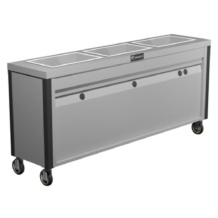 The Caddy TF-633 Hot Food Caddy Electric Slimline is a versatile and efficient solution for the food service industry, combining advanced features with a compact design. Measuring 76 inches wide, 18 inches deep, and 34 inches high, this unit is engineered for kitchens where space is at a premium. The TF-633 features an electric, enclosed heated base supporting three individual 12-inch by 20-inch by 6-3/8-inch deep hot food wells. Each insulated well is equipped with individual heat controls, enhancing temperature precision for various culinary applications. With three compartments, this hot food caddy accommodates up to twelve full-size 2-1/2-inch deep pans, offering substantial capacity for high-volume service needs. Constructed from durable stainless steel, the unit is built for longevity and resilience in demanding environments. Its vertical corner bumpers provide added protection during transport, while the 4-inch swivel casters, including two with brakes, ensure easy maneuverability and stability when stationary. Certified by ETLus and NSF, the Caddy TF-633 meets rigorous standards for safety and sanitation, making it an indispensable asset within catering services, banquet halls, and other professional food service settings that require reliable and efficient hot food holding solutions.
