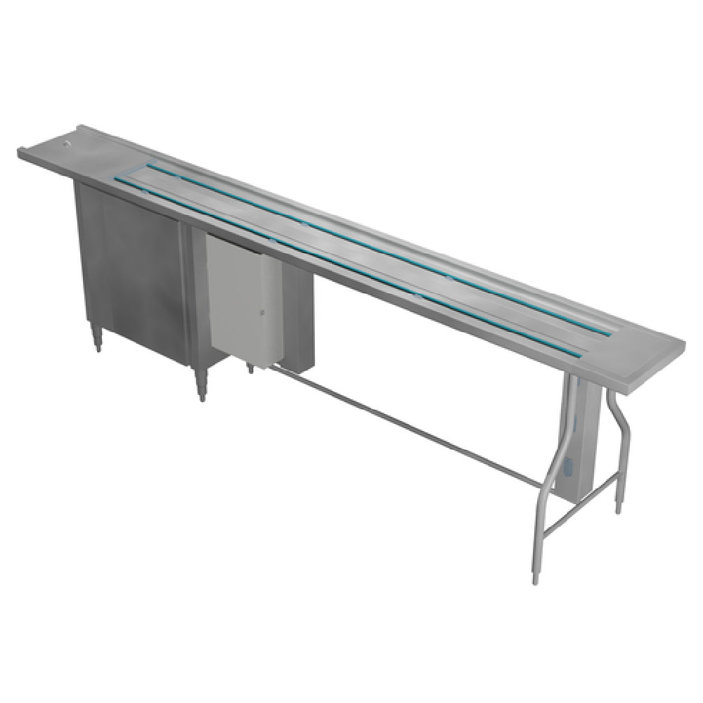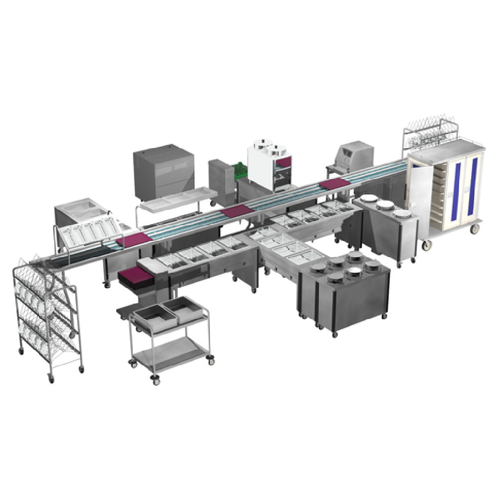 The Caddy XL-1 Express Line Tray Make-Up Conveyor is a versatile and customizable solution designed for efficient food service operations. Standing at a height of 42-1/2 inches, this conveyor can be tailored to specific length requirements, ensuring adaptability to various kitchen layouts. It features a variable belt speed ranging from 5 to 40 feet per minute, allowing for optimal control and flexibility in tray movement. The DURA-SAN belt ensures durability and hygiene, crucial for maintaining high standards in food handling processes. Manual controls, equipped with on-off and limit switches, provide straightforward operation, enhancing user convenience. Constructed with a stainless steel conveyor bed and legs, the Caddy XL-1 features adjustable bullet feet, ensuring stability and accommodating different floor surfaces. It supports flat bottom trays up to 15 inches wide, with the provision for specifying tray sizes to meet diverse service needs. Certified by ETLus and NSF, this conveyor adheres to stringent safety and sanitation standards, making it a reliable choice for settings ranging from high-volume cafeterias to institutional kitchens. Its robust construction and customizable features position the Caddy XL-1 as a valuable asset in the food service industry, capable of enhancing workflow efficiency and operational effectiveness.