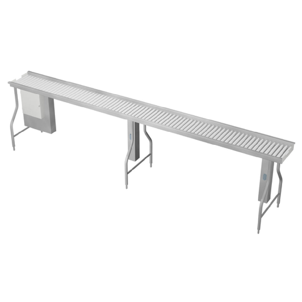 The Caddy XL-R Express Line Tray Make-Up Conveyor is a versatile and efficient solution designed to streamline operations in food service establishments. Standing at 42-1/2 inches high, this conveyor system is meticulously crafted to meet custom length specifications, ensuring it fits perfectly into any operational space. Its non-powered roller conveyor features robust 1-1/4 inch plastic rollers integrated with stainless steel balls housed in nylon bearings, all positioned on 3-inch centers, which guarantees smooth and consistent tray movement. The inclusion of raised curbing adds an extra layer of security, preventing trays from slipping during transit. The solid stainless steel pan can accommodate trays up to 16 inches wide, making it adaptable for various service needs. Supported by stainless steel tubular legs with adjustable bullet feet, the conveyor maintains stability and durability across diverse working conditions. Certified by ETLus and NSF, it meets rigorous safety and sanitation standards, making it an ideal choice for restaurants, cafeterias, and catering services looking to enhance their tray assembly efficiency while adhering to industry benchmarks. This conveyor is a testament to precision engineering, offering reliable performance tailored to the specific requirements of your establishment.