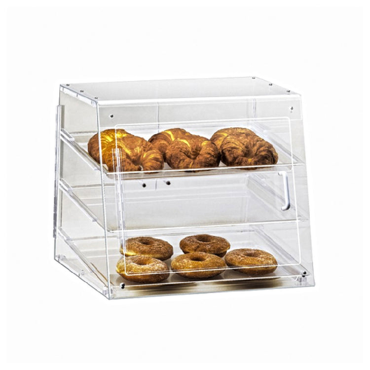 The Cal Mil 1011 Classic U-Build Display Case is a versatile 3-tier unit measuring 19-1/2"W x 17"D x 16-1/2"H, designed with a slant front and a convenient rear door for easy access, making it suitable for various display needs in the foodservice industry. This knock-down type display case requires assembly, allowing for customizable setup and efficient space utilization. The inclusion of three 13" x 18" trays provides ample room for presenting a variety of items, from pastries to retail goods. Constructed with BPA-free materials, the Cal Mil 1011 ensures safety and compliance with health standards. Its attendant serve design offers a practical solution for settings where service interaction is necessary, such as cafes, bakeries, and buffet stations. Additionally, the case is classified as UPS Oversize 1, indicating its manageable shipping dimensions. This product stands out for its blend of functionality and design, catering to diverse market segments, including businesses focused on retail display and food presentation. The Cal Mil 1011 Classic U-Build Display Case brings together essential features that enhance the display while maintaining simplicity and elegance in any setting.