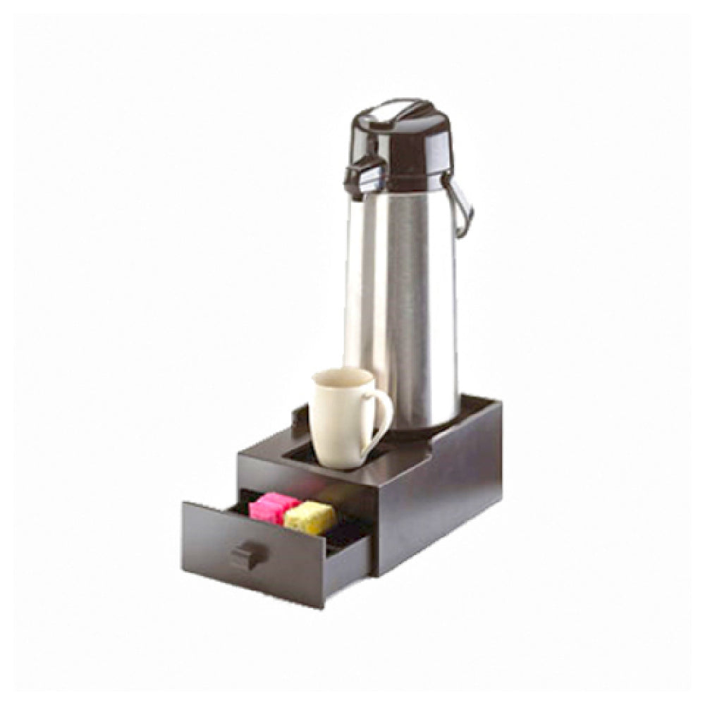 The Cal Mil 1051-1-96 Midnight Bamboo Airpot Stand is a meticulously designed single-unit stand that emphasizes both style and functionality, making it an ideal accessory for coffee service areas. Measuring 8.25 inches in width, 13.75 inches in depth, and 6.25 inches in height, this airpot stand provides a compact yet efficient solution for organizing your beverage station. Crafted from elegant midnight bamboo, it brings a touch of sophistication to any environment, while its durable construction ensures longevity and reliability. Notably, the stand includes a packet drawer, which offers convenient storage for sugar packets, stirrers, or other small items, enhancing the user experience by keeping everything tidy and within reach. Additionally, the integrated drip tray efficiently handles spills, maintaining a clean and professional presentation. Designed for versatility, this airpot stand seamlessly fits into various market segments, including hospitality, office, and catering industries, supporting diverse coffee service needs. While it does not include an airpot, its universal design is compatible with a wide range of airpots, allowing for customization to suit different operational requirements. The Cal Mil 1051-1-96 Midnight Bamboo Airpot Stand is a practical and stylish solution, offering a blend of form and function that is appreciated by professionals seeking quality and aesthetic appeal.