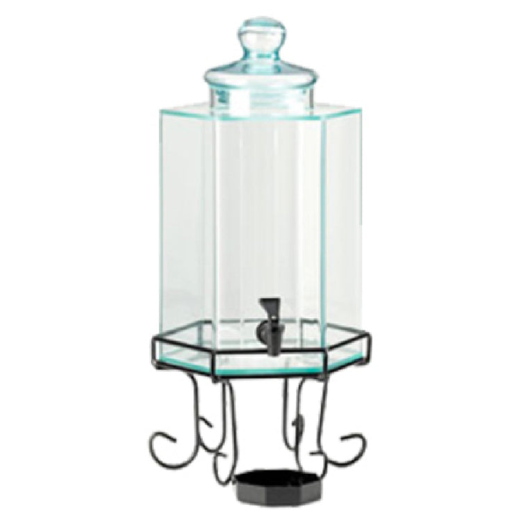 The Cal Mil 1111 Beverage Dispenser is an exceptional dispensing solution, boasting a 2-gallon capacity and dimensions of 10 inches in width, 10 inches in depth, and 22 inches in height. This beverage dispenser features a hexagonal, single beverage chamber design, which is both aesthetically pleasing and functional. It includes an ice chamber to keep beverages refreshingly cool, a secure lid, a user-friendly spigot, and a drip tray to maintain cleanliness and convenience in high-traffic settings. The glass body of this dispenser not only allows for the display of colorful beverages but also ensures durability and ease of cleaning. Supported by a robust black wire base, the design is sturdy and stable, ideal for various commercial and hospitality environments. Importantly, this product is BPA-free, aligning with health-conscious standards and ensuring safe beverage consumption. Its dimensions and design make it suitable for catering events, hotel buffets, or office settings, where both style and functionality are paramount. The Cal Mil 1111 Beverage Dispenser, with its combination of practical features and elegant design, serves as a reliable and attractive option for efficiently serving a variety of beverages in different environments.