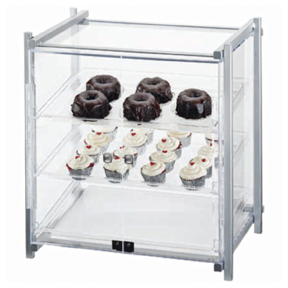 The Cal Mil 1145-S-74 One By One Display Case is a versatile countertop solution designed for various display needs in the food service industry. Measuring 20-1/2 inches in width, 17 inches in depth, and 22 inches in height, this 3-tier display case offers ample space for showcasing a variety of items. It features three shelves, each equipped with a 13-inch by 18-inch clear tray, optimizing visibility while maintaining a compact footprint. The see-thru design, coupled with a sleek silver frame, enhances the presentation of displayed items, attracting customer attention. Constructed from durable acrylic, this display case is non-refrigerated, making it ideal for self-service environments where ease of access is paramount. Its design is tailored to cater to different segment markets, including bakeries, cafes, and buffets, where attractive presentation and easy accessibility are key. The Cal Mil 1145-S-74 combines functionality with a stylish aesthetic, providing a practical display solution that maintains a professional appearance. Whether used to showcase pastries, snacks, or other items, this display case supports effective merchandising in a variety of settings, making it a valuable asset for businesses aiming to enhance their product visibility and customer engagement.
