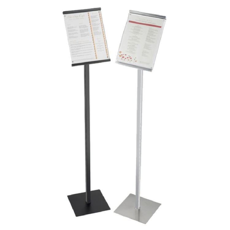 The Cal Mil 1153-46-74 One By One Sign Stand is a versatile and functional display solution designed to meet the varied needs of businesses across different industries. Standing at an impressive height of 46 inches, this freestanding sign stand is engineered to accommodate standard 8-1/2 inch by 11 inch card sizes, making it ideal for displaying menus, advertisements, or informational material. The sign stand is constructed from durable metal, ensuring long-lasting use and stability in high-traffic areas. A key feature of this model is its magnetic front, which allows for effortless and secure attachment of signage, ensuring your displays remain neat and professional. The sleek silver finish adds a modern and sophisticated touch, making it a suitable choice for environments ranging from restaurants and hotels to corporate offices and trade shows. By combining functionality with aesthetic appeal, the Cal Mil 1153-46-74 One By One Sign Stand provides a reliable and stylish solution for businesses seeking to effectively communicate their messages to customers and clients. With its robust construction and user-friendly design, this sign stand caters to the needs of various market segments, offering a practical display option that enhances any professional setting.