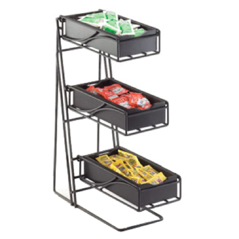 The Cal Mil 1235-13-96 Midnight Bamboo Condiment/Flatware Display is a sleek and functional solution for organizing condiments and flatware in various food service settings. With dimensions of 5-1/4"W, 14"D x 18"H, it fits well in spaces with limited room while maximizing storage and accessibility. This 3-tier display features removable midnight bamboo bins, allowing for easy cleaning and flexible arrangement of items. The bins provide a stylish contrast to the black wire frame, offering both durability and a modern aesthetic. This display is particularly useful for cafes, buffets, and catered events, where efficient organization of condiments and utensils is essential. Its sturdy construction ensures stability, making it a reliable choice for high-traffic areas. The combination of bamboo and wire materials not only enhances the visual appeal but also supports eco-conscious choices in commercial environments. Perfectly crafted for the demands of the hospitality industry, the Cal Mil 1235-13-96 provides a sophisticated and practical display solution, adding both functionality and elegance to any service counter. Its design caters to various market segments, from casual dining establishments to upscale venues, ensuring that operational needs are met with style and efficiency.