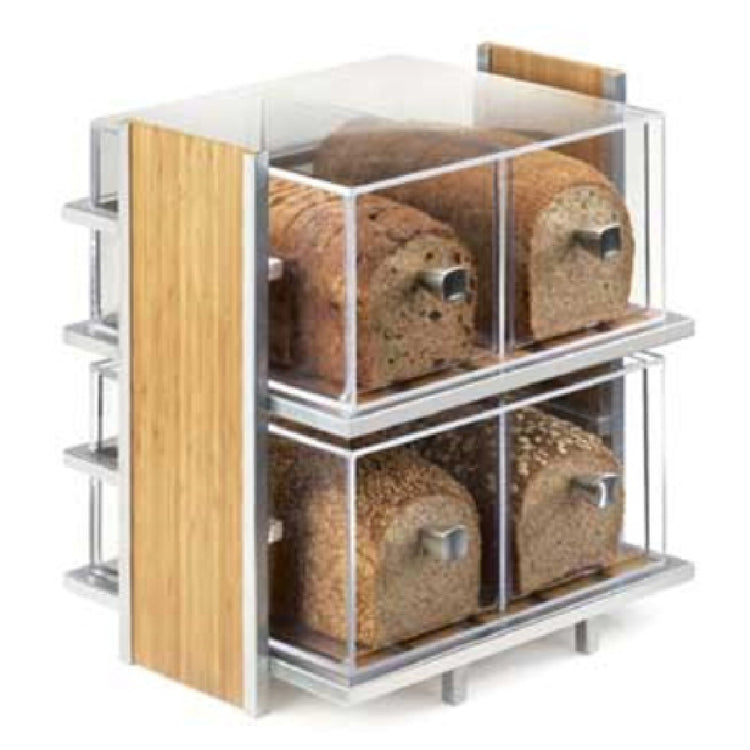 The Cal Mil 1279 Eco Modern Bread Case - 14"W x 11-1/2"D x 15"H, 2-tier is an elegantly designed, self-serve countertop unit, perfect for establishments looking to display bread and other baked goods in a stylish and functional manner. This non-refrigerated bread case features four acrylic drawers with convenient knobs, allowing for easy access and organization of products. The inclusion of bamboo accents not only contributes to its aesthetically pleasing appearance but also emphasizes sustainability, making it BPA free and environmentally conscious. Its silver metal frame ensures durability and a modern look that complements any commercial setting. The Cal Mil 1279 is particularly suitable for cafes, bakeries, or hotel breakfast bars, where it can effortlessly enhance the presentation of baked items while maintaining easy self-service for customers. Its compact size makes it easy to place on countertops without occupying excessive space, and the acrylic material ensures that contents are visible, enticing patrons. This bread case stands out in its category by combining eco-friendly materials with practical design, meeting the needs of businesses seeking both functionality and a commitment to sustainability in their service equipment.