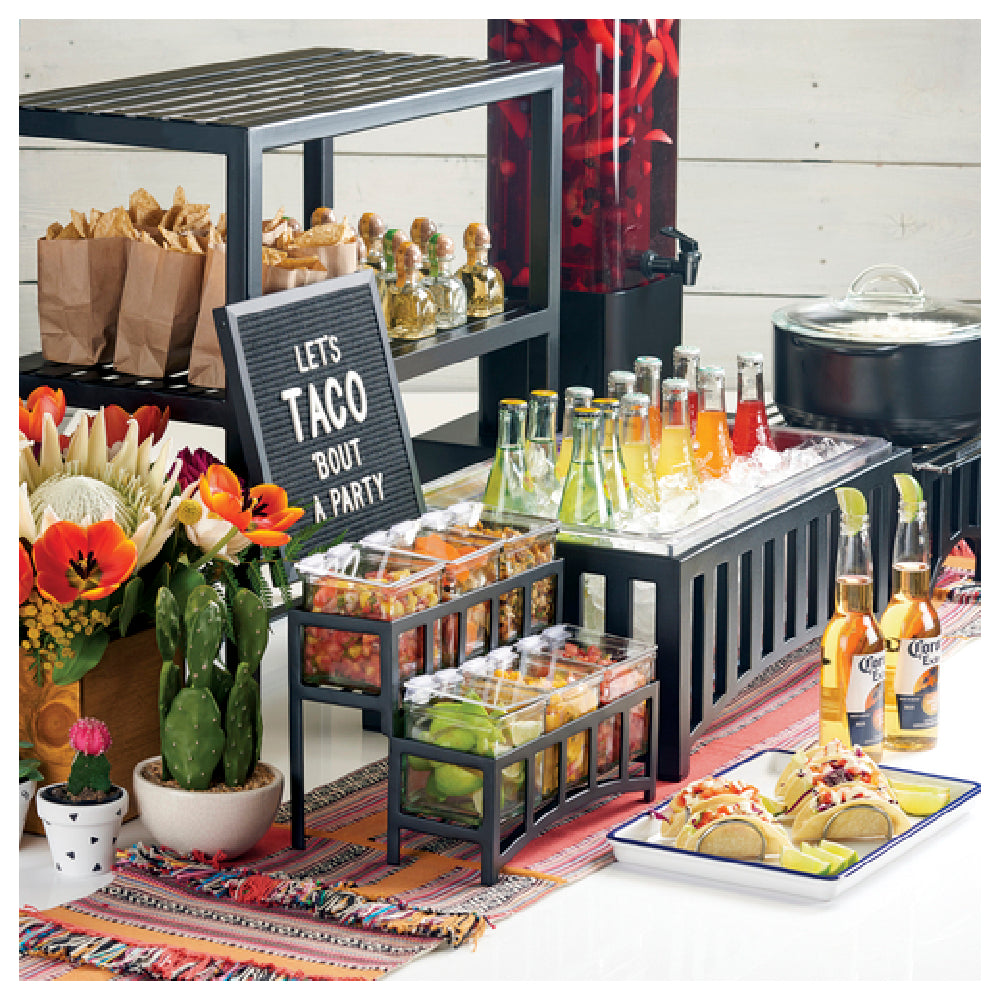 The Cal Mil 1364-12-13 Mission Chafer Alternative is a square chafer solution measuring 10-1/4 inches wide, 10 inches deep, and 5 inches high, making it an ideal choice for various catering and buffet settings. Its unique wire grill design ensures even heat distribution, while the fuel cell rail and windguard enhance its functionality by protecting the heat source from drafts, ensuring consistent warming. The bridge style construction adds to its stability and aesthetic appeal. With its sleek black finish, this chafer alternative seamlessly integrates into diverse dining environments, from upscale events to casual gatherings. Importantly, it is BPA Free, reflecting a commitment to safety and health standards. This product is particularly suited for industry segments prioritizing ease of use and reliable performance, such as hotels, restaurants, and event planners. The Cal Mil 1364-12-13 offers a practical and stylish solution, emphasizing efficient service without compromising on design or safety.