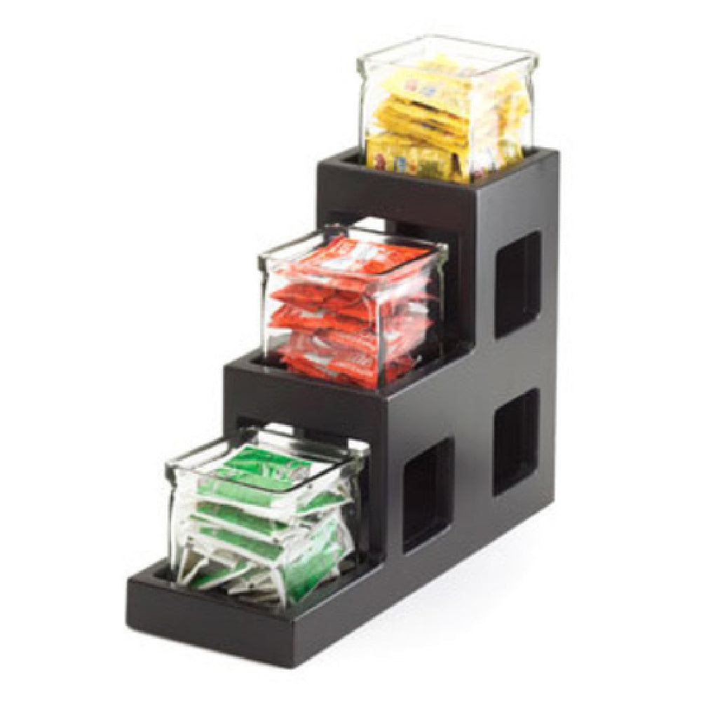 The Cal Mil 1486-96 Midnight Bamboo Jar Display is a sophisticated and efficient display unit meticulously crafted to enhance the presentation of condiments and ingredients in various settings. Measuring 5 inches in width, 14 inches in depth, and 13 inches in height, its compact design maximizes countertop space while maintaining a striking visual presence. The display features a 3-step tiered arrangement, providing easy access and visibility of its contents, which include three 4-inch by 4-inch glass jars. These jars are BPA-free, ensuring a safe and eco-friendly option for food storage and display. The Midnight Bamboo finish adds a touch of elegance and modernity, making it an attractive addition to any professional kitchen, buffet, or dining area. This display unit is particularly beneficial for businesses in the hospitality and catering industries, where effective and appealing food presentation is paramount. Its durable construction and sleek design cater to both aesthetic and functional needs, offering a practical solution for organizing and showcasing a variety of condiments, toppings, or ingredients in a stylish manner. The Cal Mil 1486-96 Midnight Bamboo Jar Display is an essential component for establishments aiming to elevate their food display standards.