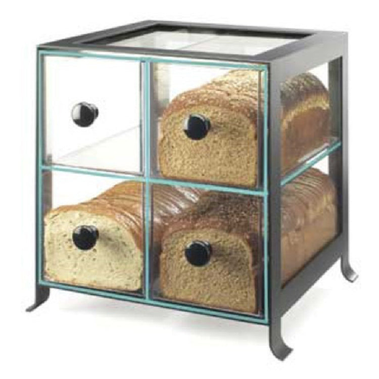 The Cal Mil 1586-13 SoHo Bread Case is a sophisticated 2-tier display unit, expertly crafted to enhance bakery presentation while ensuring practicality. With dimensions of 14 inches in width, 13 inches in depth, and 14-1/4 inches in height, it offers a compact yet ample space, perfect for showcasing an array of bread loaves or pastries. This meticulously designed bread case includes four drawers, each fitted with convenient knobs, providing an organized storage solution. Further enhancing its utility, it features four bins within an acrylic case, ensuring products remain visible and appealing to customers. The sturdy black frame not only adds a touch of elegance but also ensures durability and stability. Importantly, the case is BPA Free, reflecting a commitment to safe food storage. The Cal Mil 1586-13 SoHo Bread Case is an ideal solution for bakeries, cafes, and buffets seeking a blend of aesthetic appeal and functional design. Its distinctive features cater to various segments within the food industry, providing both a high-quality display and a safe environment for baked goods, thereby meeting the diverse needs of professional food service operations.