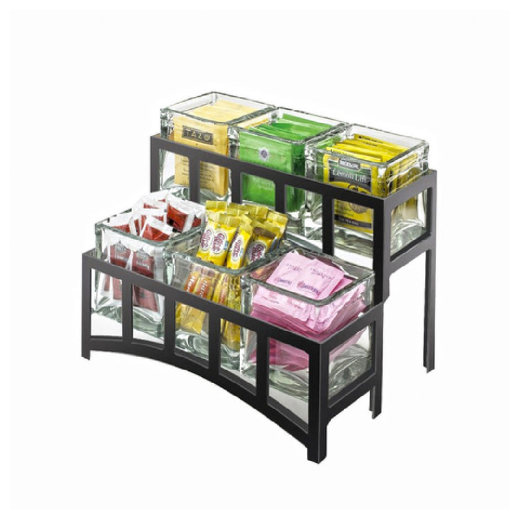 The Cal Mil 1723-39 Mission Bridge Style Caddy 14"W x 9"D x 7"H 2-tier is an innovative solution for organizing and displaying condiments or supplies in a variety of settings. This caddy features a robust two-tier design, providing ample space with its dimensions of 14 inches in width, 9 inches in depth, and 7 inches in height. It includes six glass jars, allowing for versatile storage and easy access to contents. The caddy's platinum frame adds a touch of elegance and modernity, making it an attractive addition to any establishment. Constructed with careful consideration for safety and hygiene, the materials used in this caddy are BPA free, ensuring that products stored within are kept in a safe environment. This product is particularly valuable for restaurant and food service industries, where organization and efficient space utilization are paramount. Its design allows it to fit seamlessly into both casual and upscale settings, making it a practical choice for diverse market segments. The Cal Mil 1723-39 Mission Bridge Style Caddy is not just a storage solution; it is a thoughtfully engineered product that emphasizes quality, utility, and aesthetic appeal, catering to the needs of professional environments.