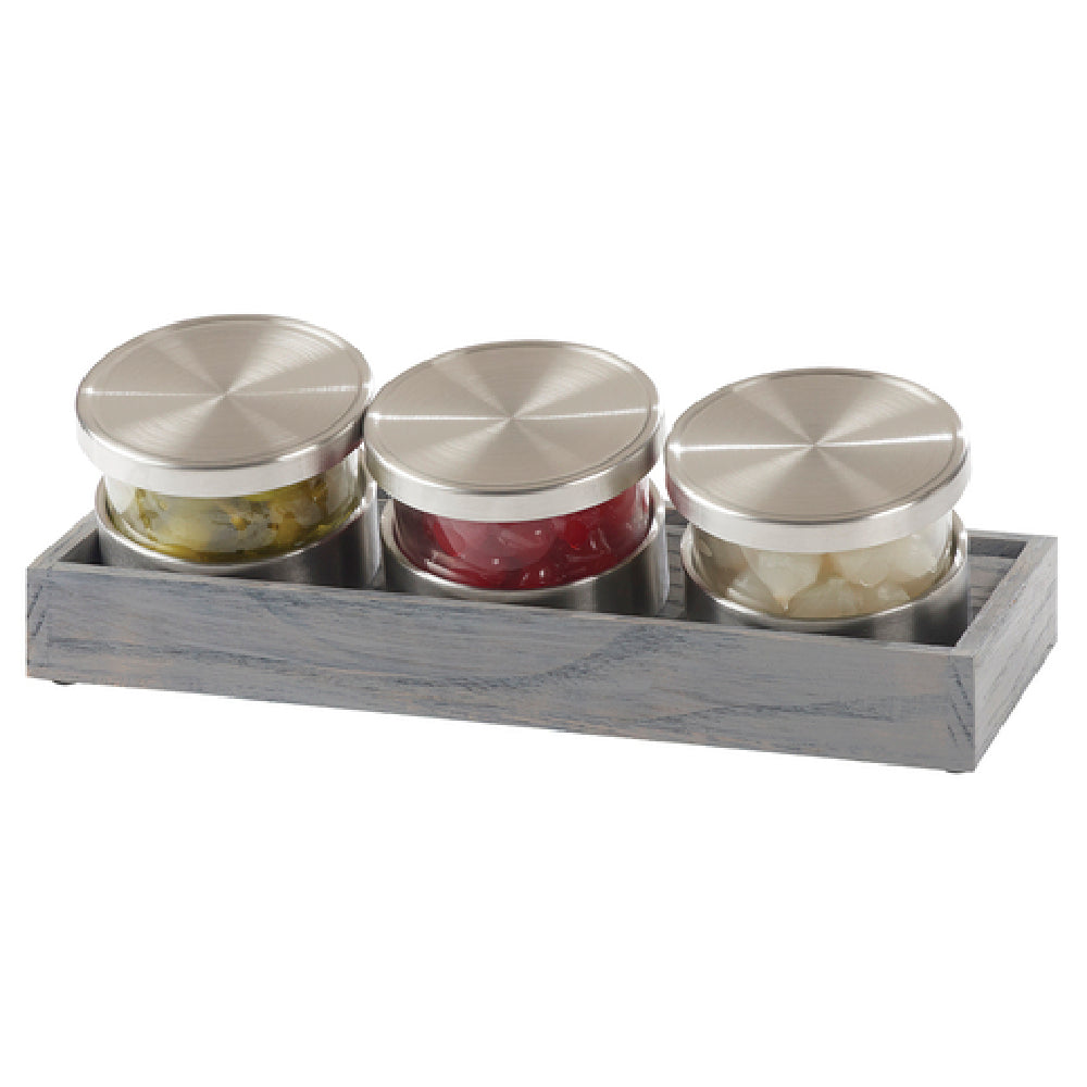 The Cal Mil 1850-4-83 Ashwood Mixology Display Set is meticulously designed for a seamless blend of functionality and style, perfect for enhancing any bar or kitchen setup. Measuring 14-1/4"W x 6"D x 5"H, this display set includes three round 16 oz. glass jars, each fitted with silicone-lined stainless steel lids to ensure a secure and airtight seal. This feature is particularly valuable for preserving the freshness of contents, making it an ideal choice for mixologists and culinary professionals who demand the highest standards. The set is complemented by cooling pucks that maintain the desired temperature of ingredients, further enhancing its versatility. The display's rectangular oak wood base, finished in a gray wash, not only adds a touch of elegance but also offers durability and stability. With a BPA-free construction, this mixology set caters to health-conscious consumers while maintaining its sophisticated appearance. The Cal Mil 1850-4-83 set is a versatile asset, suitable for high-end bars, restaurants, or home kitchens, offering a unique combination of aesthetic appeal and practical utility. Its thoughtful design and premium materials make it a standout option for those looking to elevate their presentation and efficiency in beverage or culinary settings.