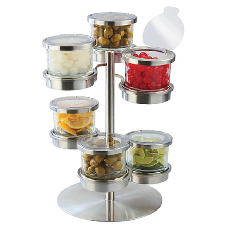 The Cal Mil 1858-4-55HL Mixology Jar Display Set is a sophisticated 6-tier unit designed to enhance presentation in any professional setting. Measuring at 14 inches in width, 11 inches in depth, and 11-1/4 inches in height, it provides an efficient and compact display solution. This set includes six 16-ounce round glass jars, each equipped with hinged stainless steel lids that ensure both durability and ease of access. The inclusion of six cold pucks is a unique feature, providing a reliable method for maintaining the temperature of contents, ideal for bars and catering events. The entire assembly is supported by a sleek stainless steel stand, which offers both stability and an elegant aesthetic. The Cal Mil 1858-4-55HL is particularly valuable for establishments looking to elevate their presentation of condiments, garnishes, or cocktail ingredients, making it a versatile choice for various segments including hospitality, food service, and event management industries. Its thoughtful design and combination of materials not only ensure durability but also add a touch of modern elegance to any setting. This display set is an excellent addition for those seeking both functionality and style in their display solutions.