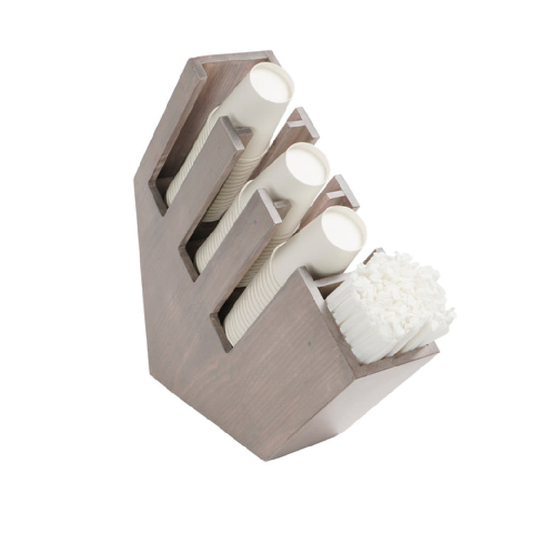 The Cal Mil 2051-110 Aspen Angled Straw Cup And Lid Organizer is a sophisticated and practical solution for organizing beverage essentials in any hospitality or foodservice setting. Measuring 19-3/4" x 5-1/2" x 20"H, this organizer is crafted from gray-washed pine wood, providing a rustic yet contemporary aesthetic that complements a variety of interior designs. It features four distinct compartments - three designed specifically for cups or lids and one dedicated to straws, ensuring streamlined service and easy access to beverage accessories. This organizer's angled design not only enhances visibility but also facilitates efficient space usage on countertops or service stations. With its durable construction and organized configuration, the Cal Mil 2051-110 offers a unique value proposition for cafes, restaurants, and event venues seeking to optimize their beverage service setups. Its thoughtful design aids in decluttering service areas, promoting an orderly presentation that enhances the customer experience. This organizer is an indispensable tool for establishments that prioritize both functionality and aesthetic appeal in their service environments.