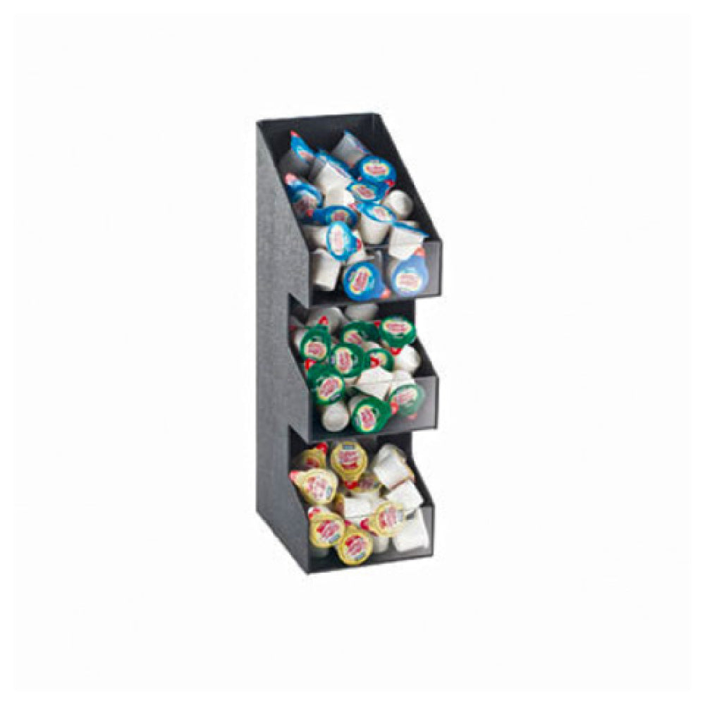The Cal Mil 2053 Classic Condiment Organizer/Display is a meticulously designed storage solution that enhances organization and accessibility for a variety of condiment setups. This single tower unit features a compact form, with precise dimensions of 5-1/4 inches in width, 6-3/4 inches in depth, and 16 inches in height, making it an optimal choice for space-conscious environments. Its three-tier bins are thoughtfully configured to accommodate an array of condiment packets, bottles, or cups for diverse service needs. The clear acrylic face provides a sleek and transparent display, allowing for easy visibility and identification of contents. Constructed with durable ABS-plastic in a sophisticated black finish, the Cal Mil 2053 is both sturdy and stylish, ensuring longevity and elegance in high-traffic settings. This condiment organizer is particularly advantageous for cafes, restaurants, and hospitality venues seeking a reliable and aesthetically pleasing organizational tool. The Cal Mil 2053's balanced combination of functionality and design makes it a valuable addition to commercial foodservice operations, efficiently streamlining condiment management while complementing the existing decor. Its practicality and minimalist design cater to a wide range of market segments, emphasizing efficient space usage and modern presentation.