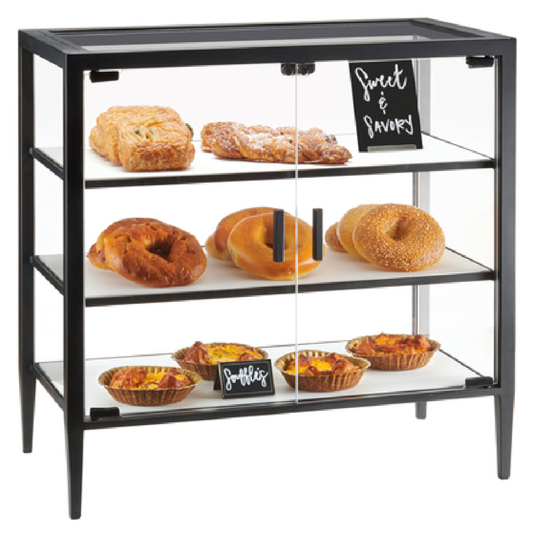 The Cal Mil 22023-26-13 Monterey Display Case is a sophisticated and functional solution tailored for diverse display needs within the foodservice and hospitality industry. Measuring 26-1/4 inches in width, 14 inches in depth, and 26-1/4 inches in height, this 3-tier countertop display case is designed to optimize space while providing an elegant showcase for various products. Equipped with dual hinged doors with handles, the Monterey Display Case ensures ease of access and convenience for both staff and customers. The inclusion of three white composite shelves provides ample space for displaying an array of items, from baked goods to packaged snacks, making it versatile for different market segments, including bakeries, cafes, and retail environments. Constructed from a combination of acrylic and steel materials, the display case offers durability and a clean, modern aesthetic that complements any setting. Its robust construction not only enhances product visibility but also ensures longevity and ease of maintenance. The Cal Mil 22023-26-13 Monterey Display Case stands as a reliable and attractive choice for businesses seeking to enhance their product presentation while maximizing countertop space efficiency.