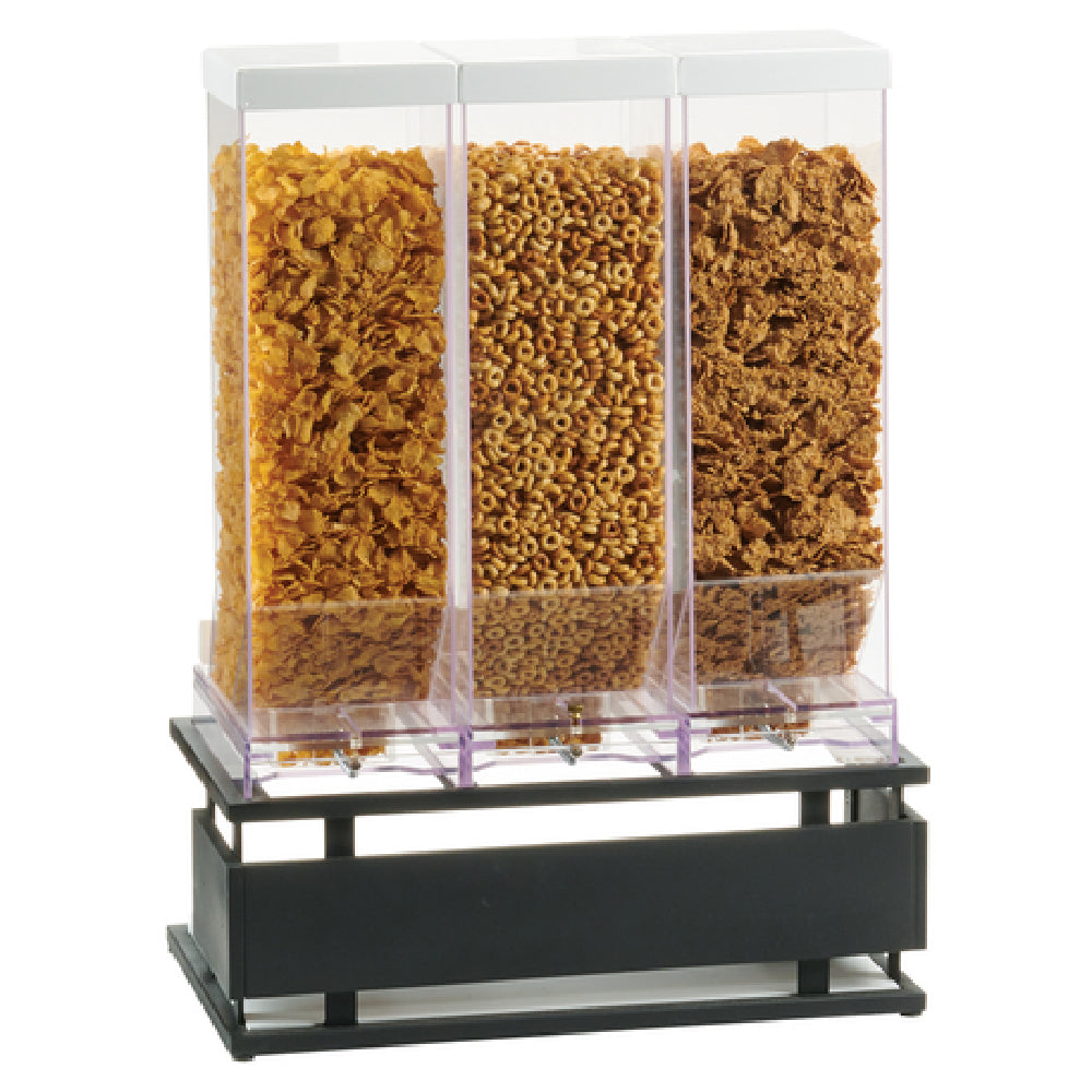 The Cal Mil 22046-13 Monterey Cereal Dispenser is a sophisticated solution designed for efficient cereal presentation and serving. With three individual 9.8L capacity bins, it provides ample storage while maintaining a compact footprint of 17-1/4"W x 10-1/2"D x 23-1/2"H, making it suitable for a variety of countertop spaces. This dispenser features a pull & serve mechanism, which allows for easy and precise portion control, minimizing waste and enhancing user experience. The integrated crumb catcher ensures cleanliness by trapping debris, thus maintaining an organized serving area. Constructed with a durable steel base, the dispenser offers stability and longevity, while its black finish adds a sleek aesthetic that complements modern dining settings. Importantly, the dispenser is BPA-free, ensuring safety and peace of mind for consumers conscious of health standards. This product is particularly valuable for hotels, buffets, and cafeterias where quick and consistent service is paramount. Its user-friendly design and robust construction make it a versatile addition to any food service establishment aiming to provide a quality cereal dispensing experience.
