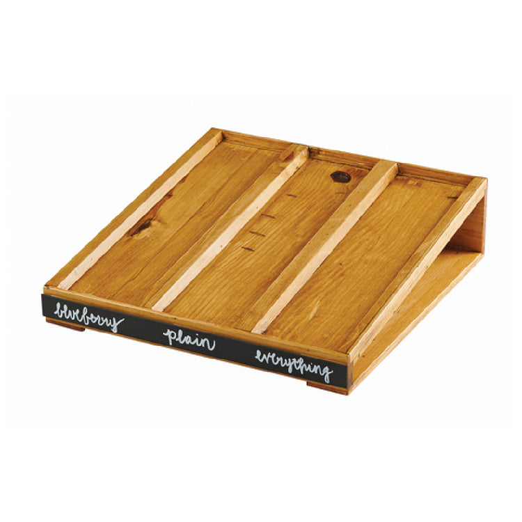 The Cal Mil 22062-99 Madera Bagel Holder Base measures 15 inches in width, 16 inches in depth, and 4-1/4 inches in height, making it an ideal accessory for food establishments aiming to present bagels in an organized and visually appealing manner. Crafted with a rustic pine frame, it provides a charming and warm aesthetic that complements a variety of culinary settings. This product is component-specific and fits seamlessly with bagel sleeves, which are sold separately, allowing for customizable display solutions tailored to specific needs. The write-on feature of the Madera Bagel Holder Base adds an extra layer of practicality, enabling clear labeling and communication for staff and customers alike. Its design and dimensions cater effectively to bakeries, cafés, and breakfast buffets, enhancing the presentation of baked goods while maintaining a versatile and functional approach. This product embodies a blend of rustic charm and modern utility, positioning itself as an essential component for establishments focused on delivering a delightful customer experience through both visual appeal and organizational efficiency.