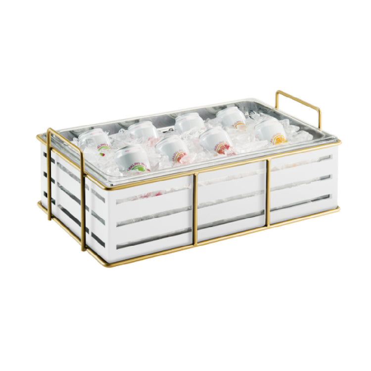 The Cal Mil 22085-12-15 Ice Housing is a versatile and practical solution for various food service settings, measuring 22 inches in width, 13-1/2 inches in depth, and 6-3/4 inches in height. This rectangular ice housing includes a clear polycarbonate pan, which provides durability and visibility, making it ideal for showcasing chilled food items or beverages. The gold wire frame adds an elegant touch, enhancing its aesthetic appeal in both casual and upscale environments. The white Empire design of the housing seamlessly integrates with a variety of decor styles, making it a functional and stylish addition to any buffet line, catering event, or hotel breakfast station. This product is tailored for restaurateurs seeking efficient and attractive ice display solutions that prioritize both form and function. Its robust construction ensures long-lasting use while maintaining a sophisticated presentation. The Cal Mil 22085-12-15 Ice Housing is perfect for those within the hospitality industry looking to elevate their service with a reliable and chic ice display option that complements a wide range of interior themes and service styles.