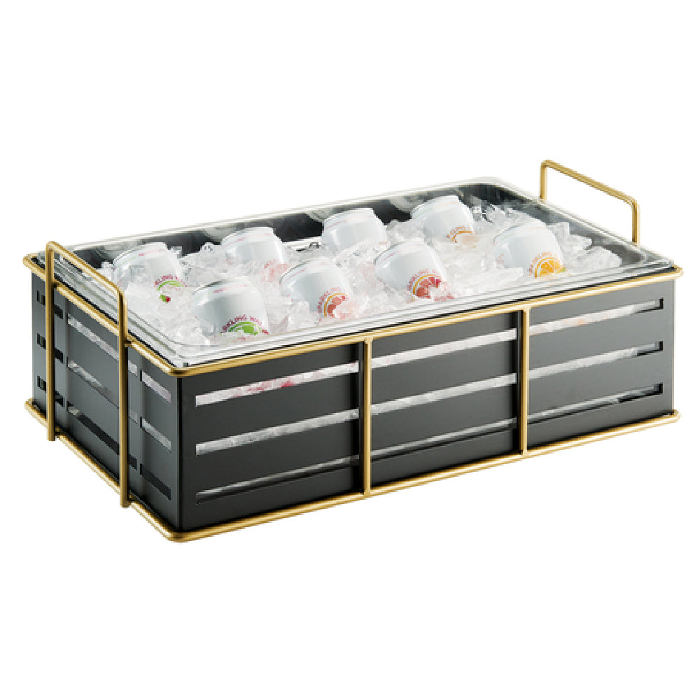 The Cal Mil 22085-12-90 Empire Ice Housing is a meticulously designed rectangular unit, measuring 22 inches wide, 13-1/2 inches deep, and 6-3/4 inches high, aimed at providing efficient ice storage solutions across various industry segments. This ice housing includes a clear polycarbonate pan, which ensures optimal visibility and easy monitoring of ice levels, making it a practical choice for busy service environments. The gold wire frame adds an element of elegance and durability, allowing the unit to seamlessly integrate into upscale settings while maintaining structural integrity. The black finish of the frame not only complements a wide range of interior designs but also offers a sophisticated touch that is appealing in both casual and formal occasions. The Cal Mil 22085-12-90 Empire Ice Housing stands out for its combination of aesthetic appeal and functional design, catering to businesses that prioritize both style and practicality in their service equipment. This makes it an ideal selection for catering events, hotel buffets, and restaurant displays where presentation and functionality are paramount. The robust construction and design elements collectively ensure that this product meets the high standards expected in the foodservice industry.