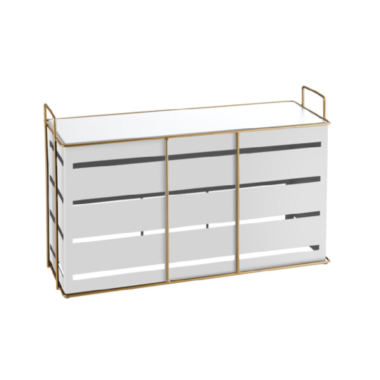 The Cal Mil 22087-13-15 Riser is a meticulously crafted piece with dimensions of 20-1/2 inches in width, 7 inches in depth, and 13 inches in height, designed to bring a sleek and modern touch to any display setting. Constructed with a striking gold wire frame, this rectangular riser is both durable and visually appealing, making it a versatile choice for various market segments, from retail to hospitality. The riser's sheet metal construction ensures stability and longevity, supporting its use in high-traffic environments. The white Empire design adds a touch of elegance, allowing it to seamlessly blend into different decor styles while highlighting the items it showcases. Ideal for creating tiered displays, the Cal Mil 22087-13-15 Riser is perfect for elevating products, from culinary dishes in buffets to merchandise in retail stores. Its robust design and stylish appearance make it a valuable addition to any professional display, enhancing the visual impact and accessibility of featured items. With its combination of functional design and aesthetic appeal, this riser meets the needs of businesses aiming to enhance their presentation capabilities without compromising on durability and style.
