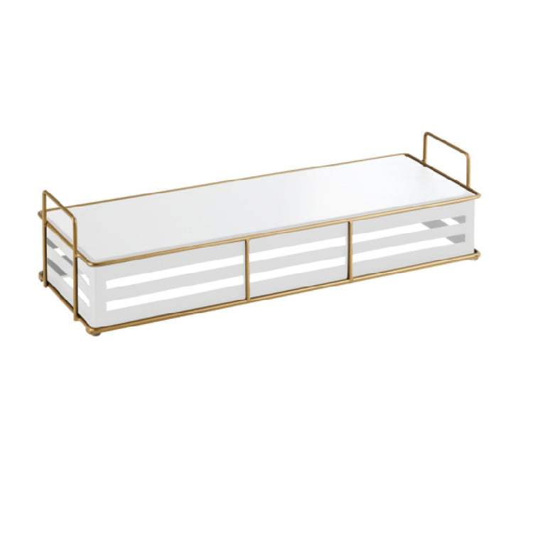 The Cal Mil 22087-5-15 Riser is a versatile and elegantly designed piece, measuring 20-1/2 inches in width, 7 inches in depth, and 5 inches in height, making it a perfect fit for various display needs across different industries. Its rectangular shape offers an ample presentation surface, crafted with a sleek gold wire frame that provides a contemporary aesthetic while ensuring structural integrity. The riser is constructed from durable sheet metal and finished in a classic white that seamlessly complements its Empire design, adding a touch of sophistication to any setting. This combination of materials not only enhances its visual appeal but also ensures long-lasting performance, catering to the needs of food service providers, retail environments, and event planners alike. The Cal Mil 22087-5-15 Riser is ideal for showcasing products or culinary creations, offering a professional display solution that enhances visibility and access. Its thoughtful design and reliable construction make it a valuable asset for businesses seeking to elevate their presentation standards and maximize the impact of their displays. Whether used in a buffet, a retail setting, or a catered event, this riser supports diverse market segments with its practical and stylish design.