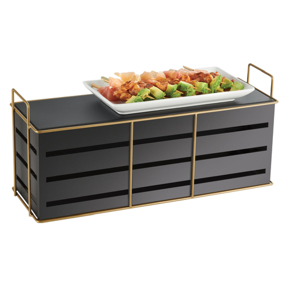 The Cal Mil 22087-9-90 Empire Riser is a meticulously crafted display accessory, measuring 20-1/2 inches in width, 7 inches in depth, and 9 inches in height. This rectangular riser is designed with a striking gold wire frame that combines elegance with functionality, making it ideal for enhancing visual presentations in various settings. The black sheet metal construction not only adds a touch of sophistication but also ensures durability and stability, providing a reliable platform for showcasing items. This riser is particularly suited for catering events, buffets, and retail displays, where its sleek design can elevate the aesthetic appeal of the presentation. The unique combination of materials and dimensions allows it to seamlessly integrate into different environments, making it a versatile choice for businesses aiming to create eye-catching displays. Whether used to highlight culinary creations or retail products, the Cal Mil 22087-9-90 Empire Riser offers a blend of style and practicality, ensuring that items are presented at an optimal viewing angle. Its distinctive gold and black color scheme adds a modern touch, making it a valuable asset for industry professionals seeking to enhance the visual impact of their presentations.