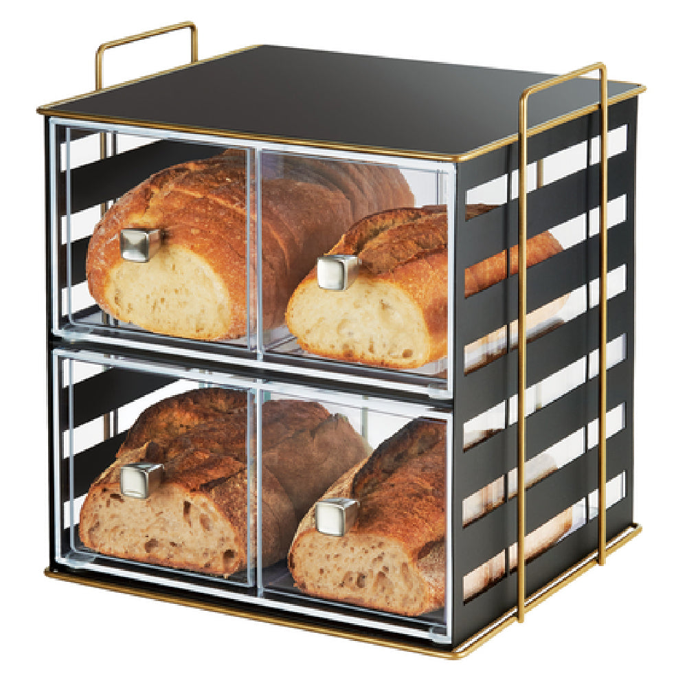 The Cal Mil 22088-90 Empire Bread Display is a sophisticated storage solution designed for the efficient presentation of bread and baked goods within commercial settings. With dimensions of 13 inches in width, 11-1/4 inches in depth, and 13-1/4 inches in height, this display provides ample space for showcasing a variety of products. It features four distinct sections, each equipped with removable drawers, allowing for versatile organization and easy access to contents. The inclusion of knobs on each drawer enhances user convenience, facilitating smooth operation. Constructed from high-quality acrylic and steel, the Empire Bread Display combines durability with a sleek aesthetic, making it an attractive addition to any bakery, cafe, or food service establishment. The black finish offers a modern and professional appearance, seamlessly integrating with various interior designs. This product's thoughtful design caters to the needs of different market segments, from small artisan bakeries to large-scale food service operations, by providing a practical and visually appealing solution for bread display and storage. Its robust construction ensures longevity, making it a valuable investment for businesses seeking to enhance their product presentation and optimize space utilization in their display areas.