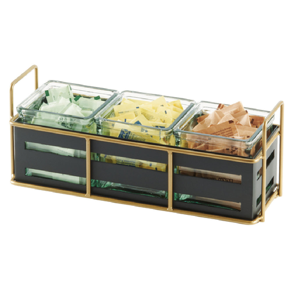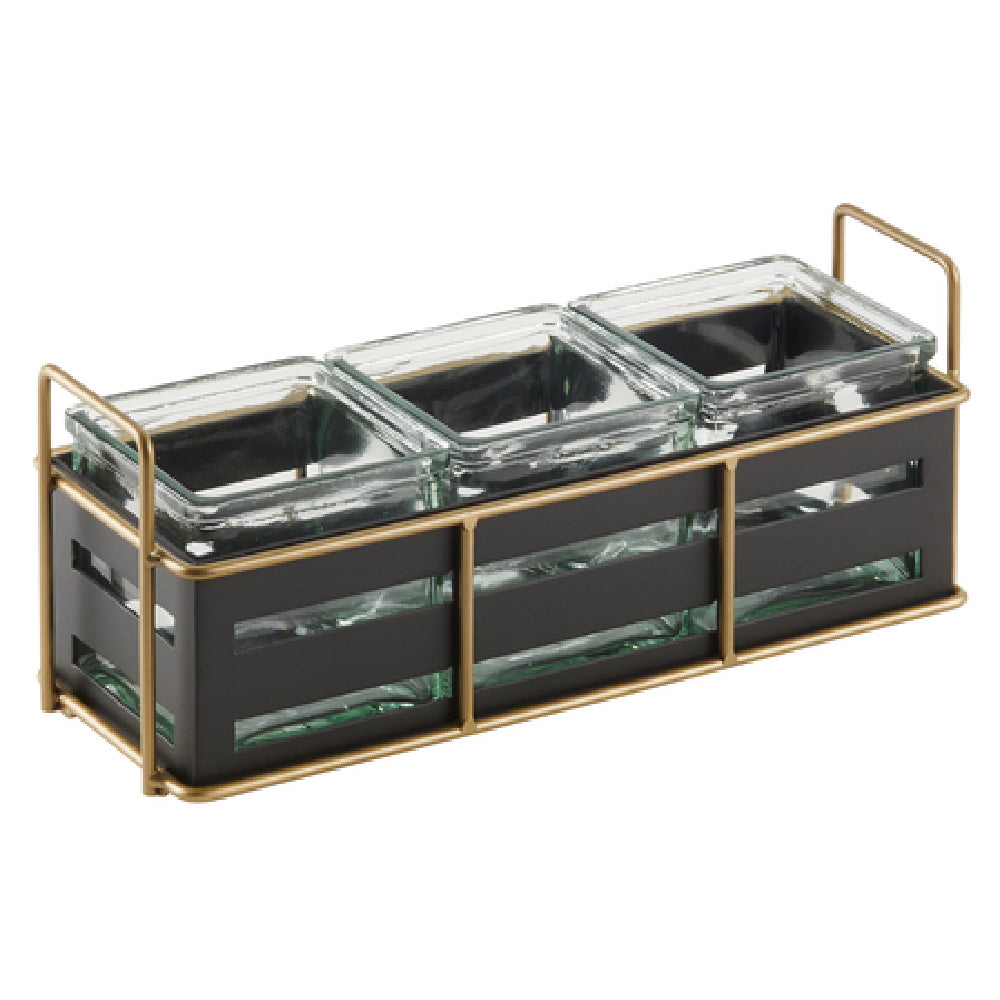The Cal Mil 22091-90 Empire Jar Display is a versatile and elegant storage solution, featuring a gold wire frame with an overall dimension of 12-1/2 inches in width, 4-1/2 inches in depth, and 5-1/4 inches in height. Included are three glass jars, making it an ideal choice for various market segments within the hospitality and food service industries. The combination of a sleek black finish and gold wire frame adds a touch of sophistication, making it suitable for upscale environments where presentation is key. The compact yet functional design allows it to fit seamlessly on countertops or buffet lines, maximizing space without compromising on style. The inclusion of three glass jars provides ample storage for condiments, snacks, or toppings, enhancing the convenience and accessibility for both staff and customers. This display is perfect for cafes, restaurants, hotels, and catering services looking to elevate their presentation while maintaining practicality. With its unique blend of aesthetic appeal and functionality, the Cal Mil 22091-90 Empire Jar Display meets the demands of settings where both form and function are essential, making it a valuable addition to any professional setting seeking to enhance their service delivery with a touch of elegance.