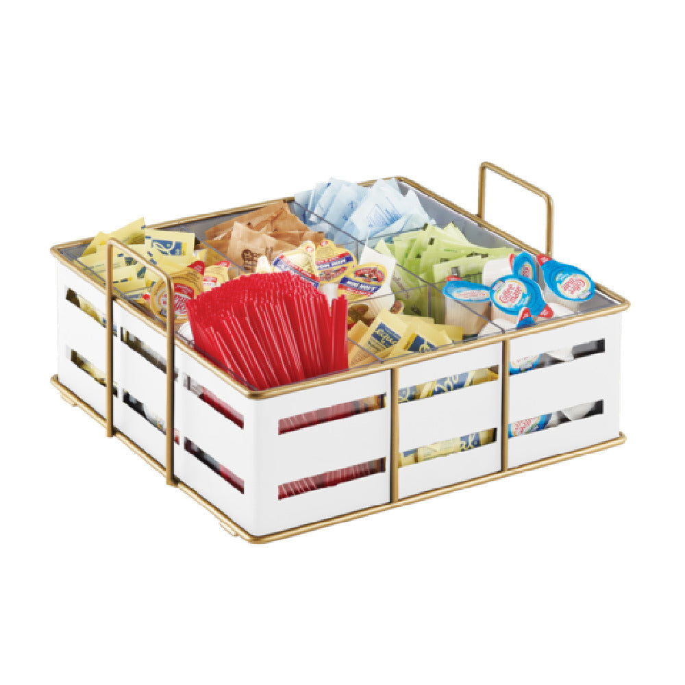 The Cal Mil 22093-15 Organizer is a versatile storage solution with dimensions of 11-3/4" width, 11-1/2" depth, and 6" height, perfectly suited for both personal and professional environments. This square organizer features nine distinct sections, allowing for efficient sorting and accessibility of various items, making it ideal for use in offices, craft rooms, or hospitality settings. Its gold wire frame not only adds a touch of elegance but also provides sturdy support and durability. The white color scheme enhances its aesthetic appeal, making it a fitting addition to any decor. Designed to optimize space utilization, the Cal Mil 22093-15 Organizer is particularly beneficial for industry professionals who require a streamlined approach to organization, such as in restaurant front-of-house stations or retail environments. Its thoughtful design and robust construction ensure it can handle frequent use while maintaining its structural integrity and visual appeal. This organizer's unique combination of practicality and style makes it a valuable asset for anyone seeking to maintain an orderly workspace without compromising on design.