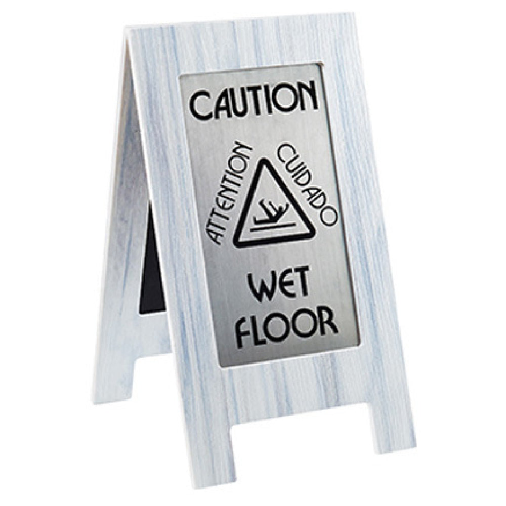 The Cal Mil 22094 Sign "Wet Floor" is engineered for functionality and durability with its water-resistant design, making it an essential safety tool for various industries. Measuring 13 inches in width, 17 inches in depth, and 23 inches in height, this sign is both compact and highly visible, ensuring it captures attention effectively in any environment. Designed with a composite frame, it combines a white wash wood appearance with the strength of stainless steel, providing a sleek yet sturdy construction. The double-sided feature enhances visibility from multiple directions, crucial for high-traffic areas. Additionally, it includes two silver metal caution plates, adding a reflective quality that enhances its alerting capability, especially in low-light conditions. Bilingual text ensures that it communicates effectively to a diverse audience, thereby meeting multilingual needs in public spaces. This sign is perfectly suited for facilities management in commercial, retail, and hospitality sectors that prioritize safety and compliance with hazard notification standards. The thoughtful blend of materials and design in the Cal Mil 22094 Sign "Wet Floor" promises longevity and reliable performance, making it an indispensable addition to any safety protocol toolkit.