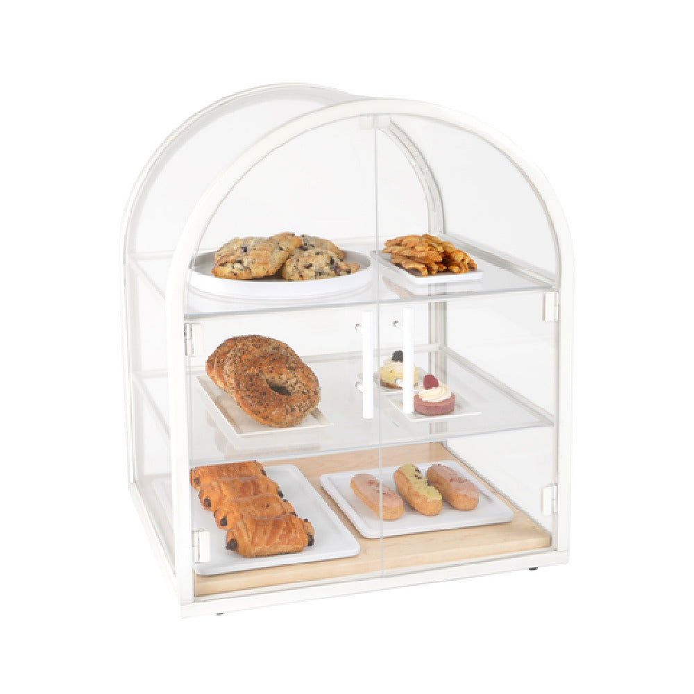The Cal Mil 22410-15 Blonde Arched Display Case is an elegantly designed ambient display option, measuring 18-1/2" x 21" x 25-3/4" H. Engineered with three spacious shelves, it caters to a range of display needs, making it an ideal choice for restaurants, cafes, and bakeries looking to showcase their products effectively. The clear doors and panels offer excellent visibility, allowing customers to easily view the displayed items while maintaining the freshness and quality of the products inside. The blonde finish adds a touch of sophistication and seamlessly blends with various interior decors, enhancing the aesthetic appeal of any establishment. This display case is particularly beneficial for businesses aiming to highlight their offerings without compromising on style or functionality. Its ambient nature ensures that products are beautifully presented at room temperature, making it suitable for a variety of goods such as pastries, breads, and other non-perishable items. The Cal Mil 22410-15 combines practicality with an inviting design, providing a reliable solution for establishments aiming to optimize their display capabilities while maintaining a professional and appealing presentation.