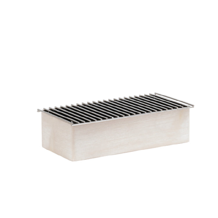 The Cal Mil 22422-113 Chafer 19-3/4"W x 10"D x 5-1/2"H is a distinctive serving piece that merges vintage charm with functionality, making it a versatile addition for various segments within the food service industry. This chafer's vintage wood frame is crafted from white-washed pine wood, imparting a rustic yet elegant aesthetic that enhances any buffet or catering setup. The bold grill design adds a robust visual appeal while facilitating efficient heat distribution, ensuring that dishes are served at optimal temperatures. Measuring 19-3/4 inches in width, 10 inches in depth, and 5-1/2 inches in height, this chafer provides ample space for a variety of dishes, accommodating diverse menu offerings. The Newport style underscores a timeless elegance, making it suitable for high-end banquets as well as casual dining settings. Its construction not only emphasizes durability but also aligns with contemporary design trends, offering a sophisticated presentation platform for culinary masterpieces. This chafer is a strategic choice for event planners, caterers, and restaurateurs seeking a product that combines aesthetic appeal with practical design, ensuring a memorable dining experience for guests. Its unique features cater to the needs of modern culinary environments by providing both style and functionality.