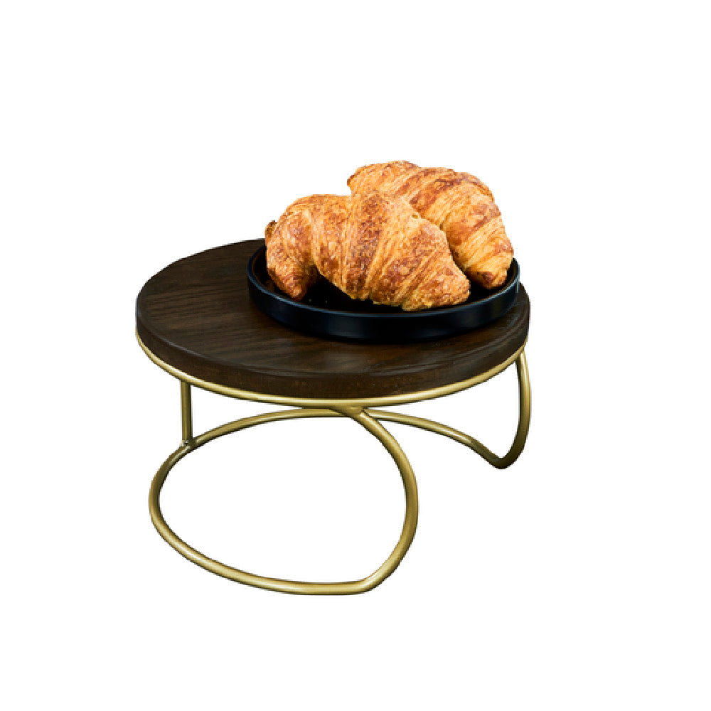 The Cal Mil 22425-6-112 Heritage Riser 12" x 12" x 6"H Round is a versatile and elegantly designed display solution, featuring a matte gold wire base paired with a dark stained oak top. This riser's dimensions, 12 inches by 12 inches with a height of 6 inches, make it suitable for a range of display needs, providing an elevated platform that enhances visibility and presentation of various items. The combination of its sturdy wire construction and the rich, dark oak finish creates a sophisticated aesthetic, ideal for upscale dining establishments, catering events, and retail spaces. The matte gold base adds a touch of modern elegance, while the oak top offers a classic touch, making it adaptable to both contemporary and traditional settings. The Cal Mil Heritage Riser is not only a functional piece but also a statement of style, perfect for showcasing culinary creations or merchandise. Its robust design ensures stability and durability, meeting the demands of high-traffic environments. This product serves as an exceptional choice for industry professionals seeking to enhance their display arrangements with a mix of elegance and practicality.
