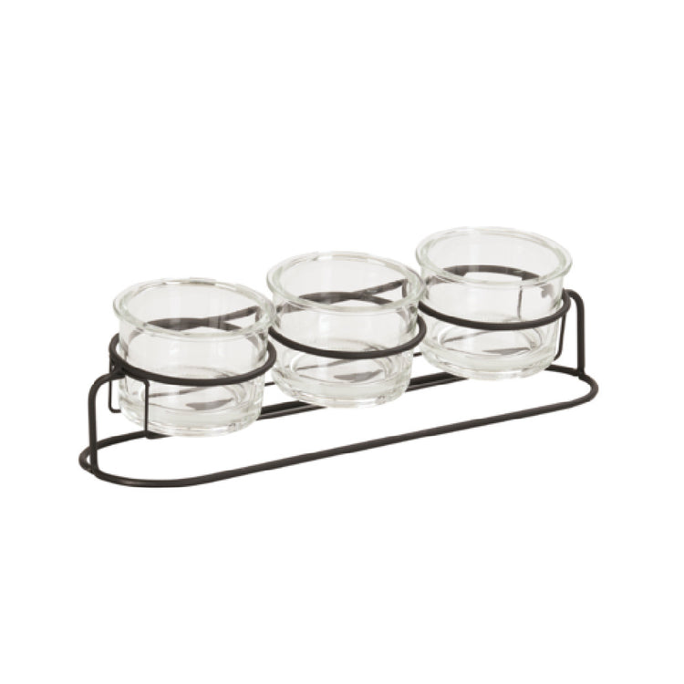 The Cal Mil 22602-32-13 3 Jar Display is a compact and functional display unit measuring 6" in width, 5" in depth, and 4-1/2" in height, designed to efficiently showcase and store contents in a visually appealing manner. This display includes three 32 oz. jars, making it particularly suitable for food service settings that prioritize both organization and accessibility. The sleek black finish and Madison design enhance its aesthetic appeal, allowing it to seamlessly integrate into various environments, from upscale dining establishments to casual eateries. These jars are ideal for storing and displaying a range of products, such as condiments, toppings, or other essentials, providing both employees and customers with quick and easy access. The design emphasizes durability and practicality, ensuring that it can withstand the demands of busy commercial settings. This display unit can cater to a variety of market segments, including cafes, restaurants, and catering services, offering a solution that balances form and function. With its sturdy construction and thoughtful design, the Cal Mil 22602-32-13 3 Jar Display is an indispensable tool for efficient service and effective presentation in the food and beverage industry.