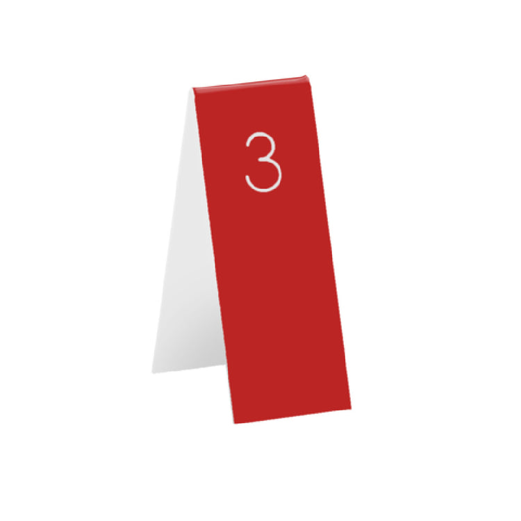 The Cal Mil 22623-1 Engraved Number Tent is a meticulously designed identification tool measuring 1-3/4 inches in width and 5 inches in height, presented in a vertical orientation. This product is crafted to cater to a wide array of industry segments such as hospitality, event management, and food service, where clear and efficient table or item numbering is essential. Available in a striking red and white color scheme, which can be customized as per a detailed color chart, the tent allows users to specify both the number and the color to best suit their operational needs. Its engraved design ensures longevity and resistance to wear, making it a practical choice for repeated use in high-traffic environments. The Cal Mil 22623-1 Engraved Number Tent is an ideal solution for establishments seeking a durable, customizable, and visually appealing numbering system that enhances organization and customer service efficiency. With its precise dimensions and color customization options, this product stands out as a reliable choice for businesses aiming to maintain a professional and orderly presentation.