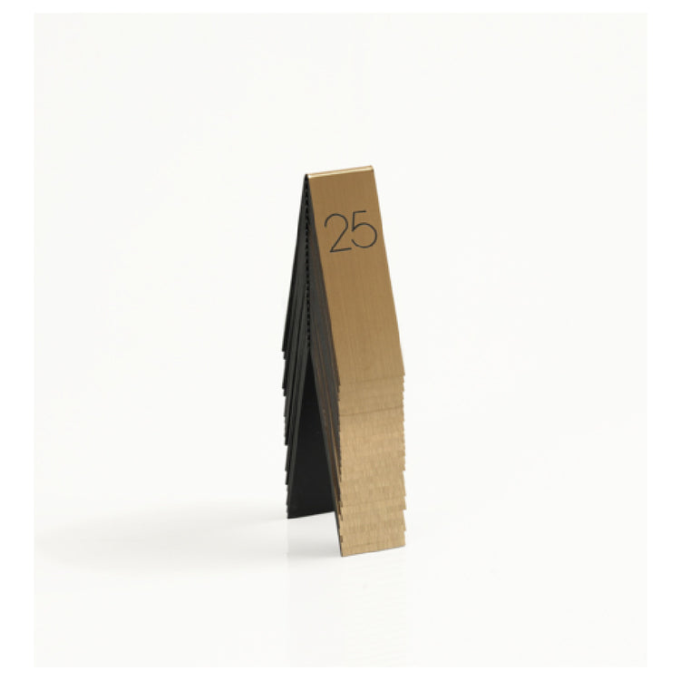 The Cal Mil 22623A-11 Engraved Number Tent Set (1-25) is an elegantly designed accessory tailored for versatile usage across various industry segments. With dimensions of 1-3/4"W x 5"H, each number tent in this set is crafted for vertical display, ensuring clear visibility and ease of identification in fast-paced environments. The striking gold and white color scheme, as specified in the color chart, adds a touch of sophistication and professionalism to any setting, whether it be in hospitality, event management, or corporate functions. This engraved number tent set effectively caters to organizational needs by providing a straightforward method of managing table assignments or queue systems. Its robust construction ensures durability and longevity, making it a cost-effective solution for businesses seeking reliable and aesthetically pleasing numbering tools. The Cal Mil 22623A-11 Engraved Number Tent Set is a valuable asset for establishments that prioritize both functionality and style in their operations.