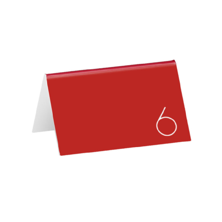 The Cal Mil 22625-1 Engraved Number Tent 5"W X 3-1/2"H Horizontal is a versatile signage solution designed for various industry segments requiring clear and precise number displays. Crafted with dimensions of 5 inches in width and 3-1/2 inches in height, this horizontal number tent is ideal for efficient organization and easy visibility in any setting. The product is distinguished by its engraved numbers, which ensure long-lasting clarity and resistance to fading, making it suitable for high-traffic environments. Available in a striking red/white color scheme, its aesthetic appeal is further customizable as users can specify both the number and color according to their particular needs. This feature is particularly beneficial for businesses such as restaurants, hotels, and event venues that require distinct and durable numbering signs for tables, rooms, or seating areas. The Cal Mil 22625-1 number tent serves as a practical and reliable choice with its balance of functionality and customizable options, tailored to streamline operations and enhance customer experiences.