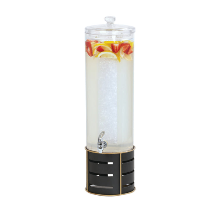 The Cal Mil 22631-3-90 Beverage Dispenser is a meticulously designed unit measuring 10-1/2 inches in diameter and standing 24 inches tall. It features an innovative ice chamber that ensures beverages remain refreshingly cold throughout service. This round beverage dispenser is part of the esteemed Empire collection, characterized by its sleek black finish that adds a touch of elegance to any display or service setting. Its thoughtful design is ideal for catering events, buffet lines, and self-service stations, providing both functionality and aesthetic appeal. The size and shape of the Cal Mil 22631-3-90 make it perfect for both intimate gatherings and larger events, offering versatility in its application across various settings. Constructed with attention to detail, this dispenser not only meets the demands of frequent use but also ensures that beverages are presented in a visually appealing manner. Its robust construction and practical features cater to the needs of the foodservice industry, making it a valuable addition to any professional setting. The black color scheme of the Cal Mil 22631-3-90 seamlessly integrates with various decor styles, enhancing the ambiance while delivering exceptional beverage service.