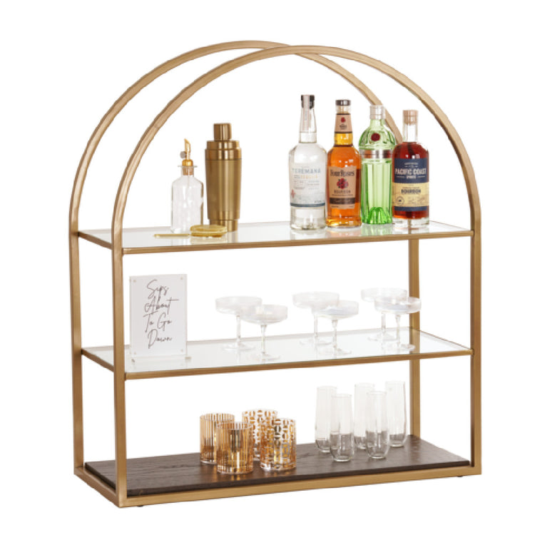 The Cal Mil 22904-112 Merchandiser is a meticulously designed display unit, offering a three-tiered structure with dimensions of 33-1/2"W x 13-3/4"D x 38-1/4"H. This merchandiser is characterized by its elegant arched frame, combining aesthetic appeal with functional design. Constructed with a striking blend of gold metal and dark wood shelves, it embodies the Heritage style, making it a visually appealing choice for upscale retail environments. Each tier provides ample space for product display, enhancing visibility and accessibility, which is vital for visual merchandising in cafes, bakeries, or retail stores. The robust construction ensures durability, while the combination of materials adds a touch of sophistication, suitable for high-end establishments. The Cal Mil 22904-112 Merchandiser's design is not just about aesthetics; it is engineered to effectively showcase a variety of products, maximizing retail potential and enhancing customer engagement. Its size and structure make it versatile enough to fit in various spaces while ensuring it can handle a substantial display load, making it a compelling choice for businesses aiming to present their products in a stylish yet practical manner. This merchandiser is a testament to Cal Mil’s commitment to quality and innovative retail solutions.