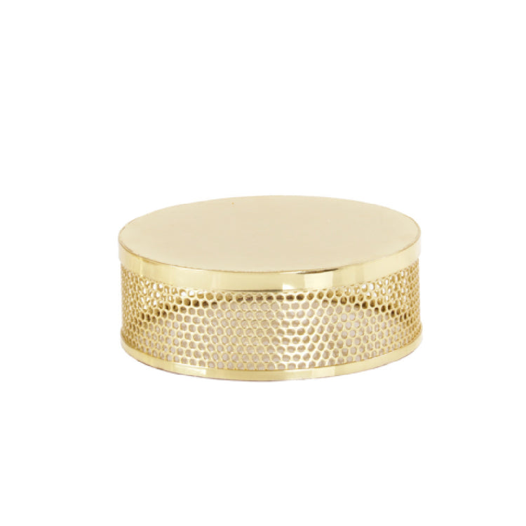 The Cal Mil 22916-3-116 Riser 7-1/2"dia. X 3"H Round is a sleek and stylish product designed to elevate the presentation of various food items. With a diameter of 7-1/2 inches and a height of 3 inches, this round riser is crafted to provide an elegant display solution. Its shiny gold finish adds a touch of sophistication, making it a standout piece for any dining setting, from upscale restaurants to casual buffets. The Monaco collection, to which this riser belongs, is known for its modern design elements and durable construction. This riser is not only visually appealing but also practical, as it can be used to create tiered serving arrangements, maximizing table space and enhancing the visual appeal of the presentation. Perfect for catering events, banquets, or everyday dining environments, the Cal Mil 22916-3-116 Riser is a versatile addition to any food service operation, providing a unique value by combining aesthetics with functionality.
