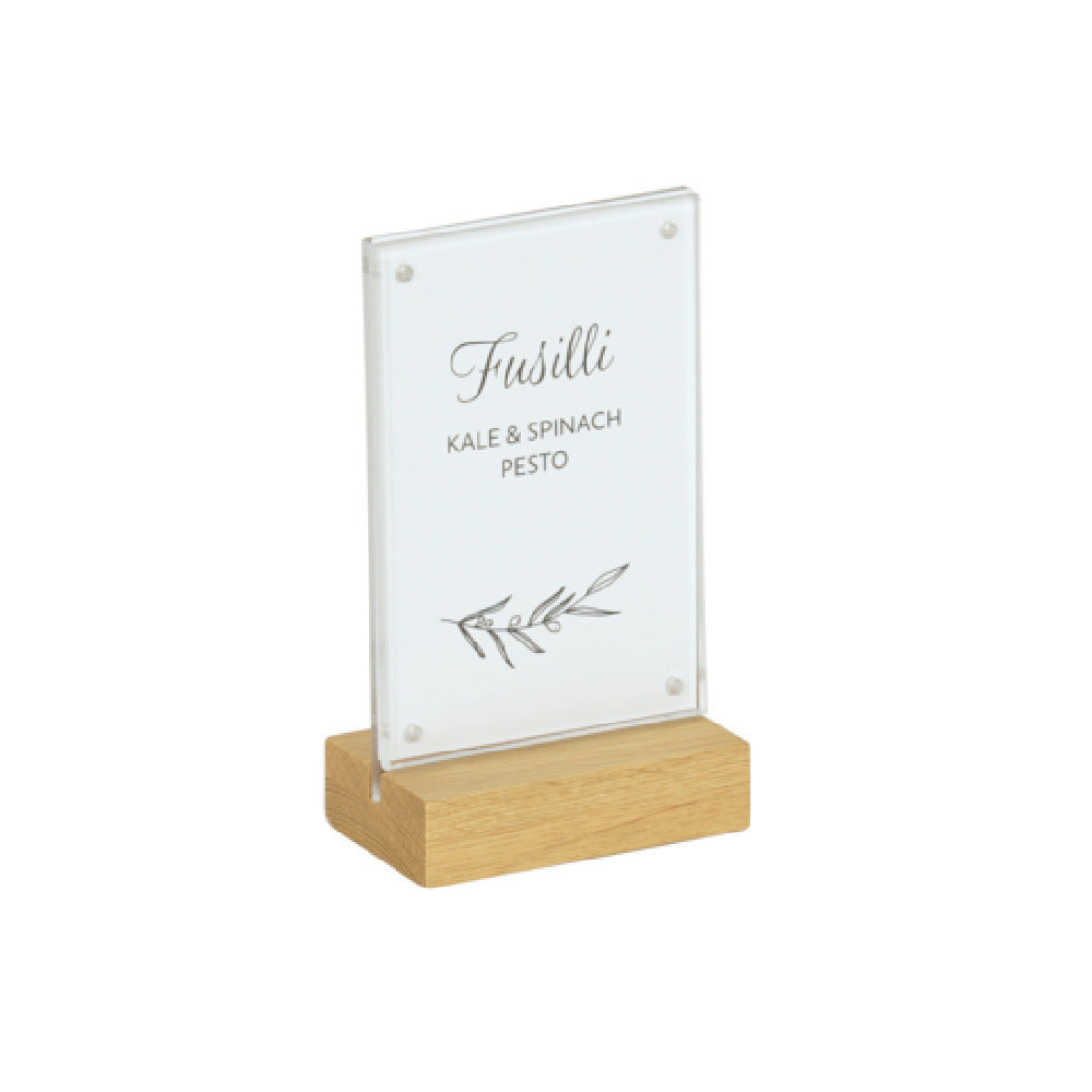The Cal Mil 23185-46-21 Sydney Card Holder is a meticulously crafted display item designed to meet the needs of various professional settings with its elegant design and practical dimensions. Measuring 4 inches in width, 2.5 inches in depth, and 6.5 inches in height, this card holder is adeptly sized for optimal visibility and space efficiency. Constructed from high-quality oak, the Sydney Card Holder not only offers durability but also adds a touch of sophistication to any desktop or counter. Its sturdy build ensures the cards remain securely in place, making it a reliable choice for showcasing business cards, informational pamphlets, or promotional materials. The natural finish of the oak provides a classic aesthetic appeal, making it suitable for use in corporate offices, retail environments, or hospitality settings. Whether utilized in a hotel reception area, a retail store, or a professional office, the Cal Mil Sydney Card Holder is a versatile accessory that enhances organization and presentation. Its straightforward design underscores functionality while maintaining an understated elegance, catering to a range of industries looking to elevate their professional image with attention to detail and quality craftsmanship.