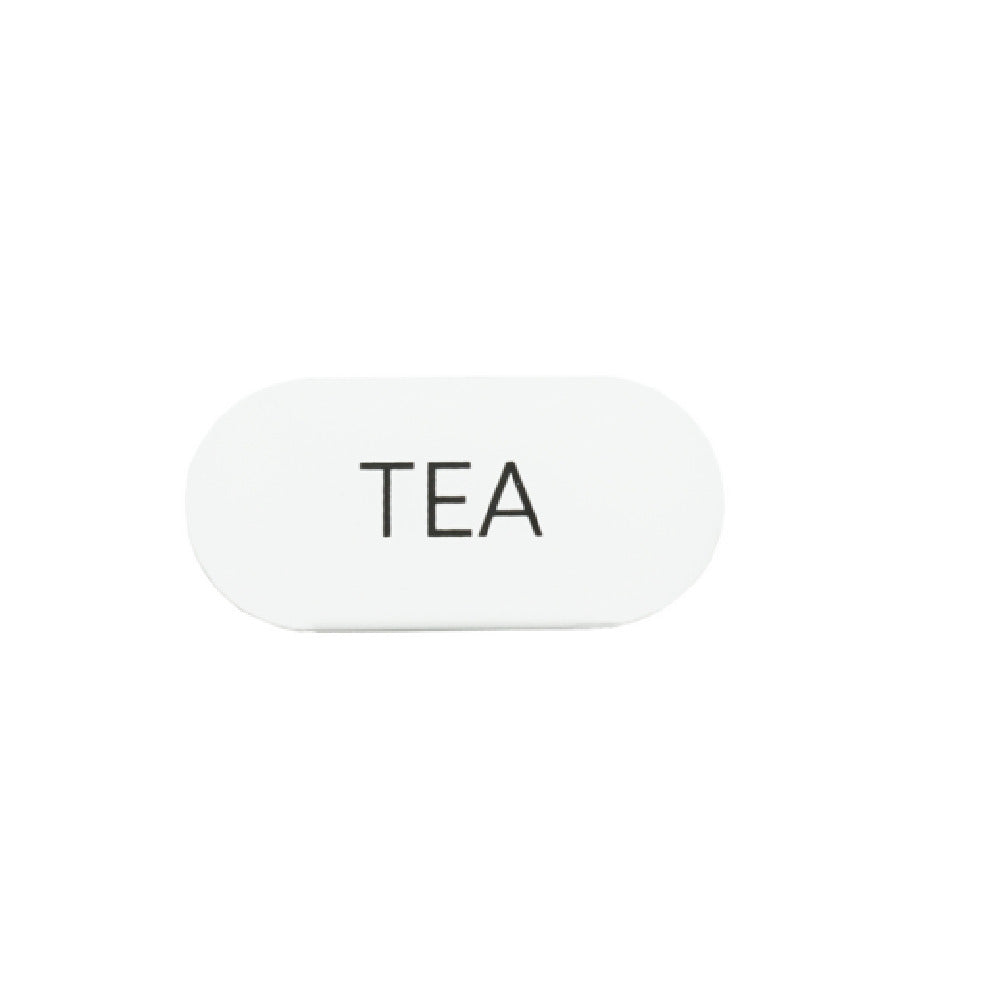 The Cal Mil 23401-4-15 Juno Tent "Tea" 4.5"W X 2"H Oval is an elegantly designed display accessory, crafted to enhance the presentation of teas in various hospitality settings. This product boasts precise dimensions of 4.5 inches in width and 2 inches in height, making it a compact yet noticeable feature on any table or serving station. Its oval shape provides a unique aesthetic appeal, distinguishing it from standard rectangular or circular tent cards. Constructed from durable white metal, the Juno Tent ensures longevity and resilience, even in high-traffic environments such as restaurants, cafes, and hotels. This metal construction not only enhances durability but also facilitates easy maintenance and cleaning, ensuring that it remains a pristine part of any display. The versatile design of the Cal Mil 23401-4-15 makes it suitable for a variety of market segments within the hospitality industry, from casual dining establishments looking to add a touch of class to their service, to upscale venues aiming for a sleek and modern presentation. Its understated elegance and practical functionality combine to make this tent card an essential tool for effectively communicating the beverage options to patrons.