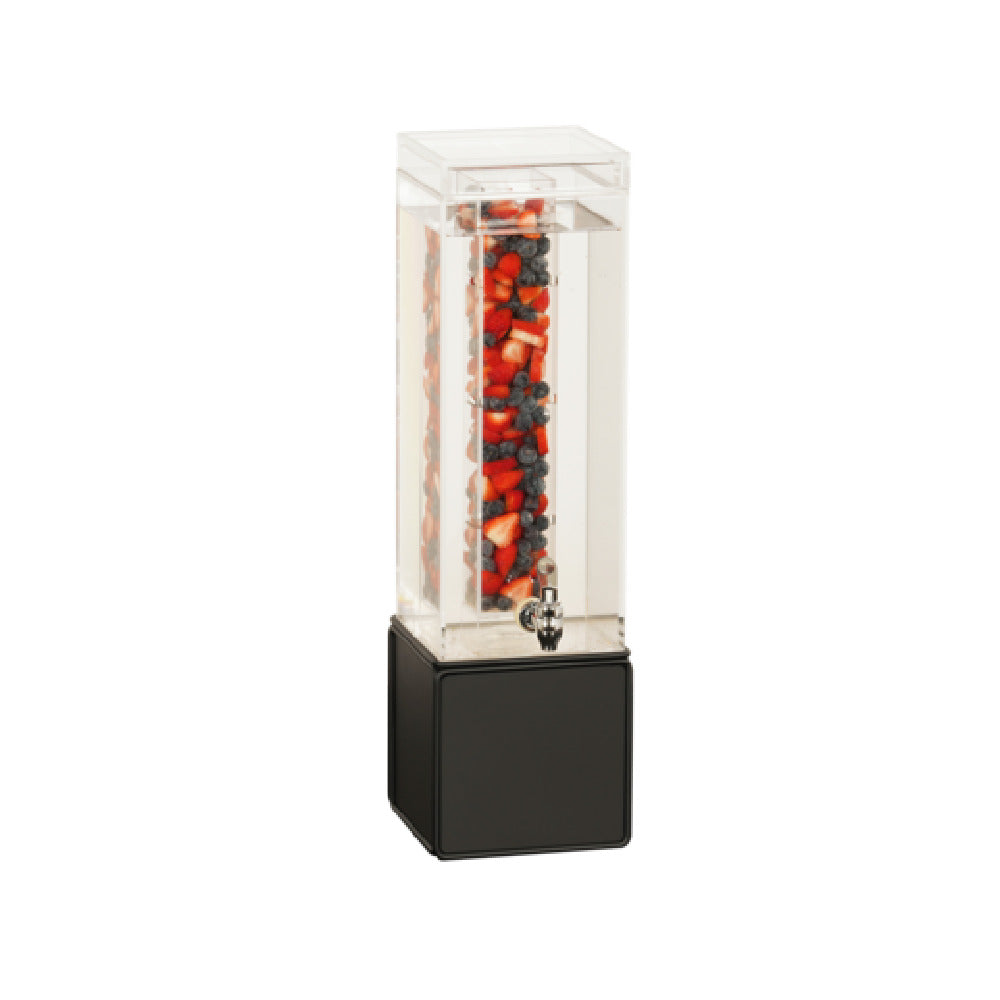 The Cal Mil 23701-3INF-13 Beverage Dispenser is a meticulously crafted unit designed to meet the needs of various market segments within the beverage industry, measuring 8.25 inches in width, 10 inches in depth, and 24 inches in height. This dispenser boasts a substantial 3-gallon capacity, making it ideal for catering events, hospitality services, or large-scale beverage service operations. A distinctive feature of this dispenser is its infusion chamber, which allows for creative beverage presentations by infusing flavors into the drinks, enhancing customer experience. Constructed from black metal, the dispenser ensures durability and a sleek, modern aesthetic that fits well in any setting. The spigot, paired with a sturdy stand, offers ease of use and stability, ensuring seamless service in high-traffic environments. The Onyx finish provides an elegant touch, making it a versatile choice for businesses seeking both functionality and style. Whether for a restaurant, café, or event venue, the Cal Mil 23701-3INF-13 Beverage Dispenser provides a reliable and visually appealing solution for all beverage dispensing needs.